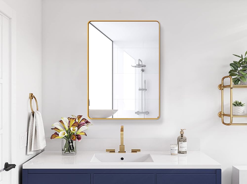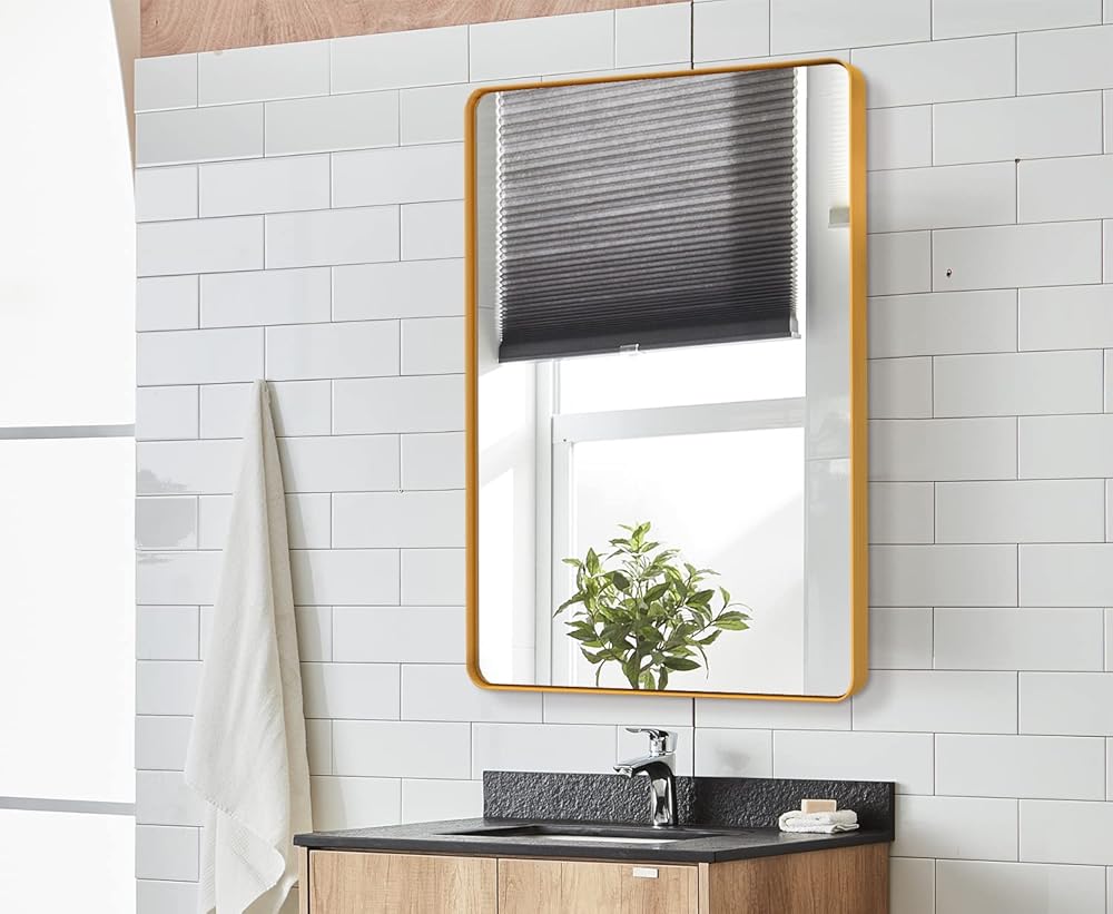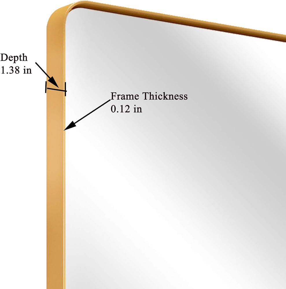 مرآة حمام بإطار معدني ذهبي للجدار، مقاس 22 × 30 بوصة، مستطيلة مستديرة غير لامعة، مرآة مزرعة للحمام باللون الذهبي، مقاومة للصدأ، مقاومة للانفجار، يتم تعليقها أفقيًا أو رأسيًا