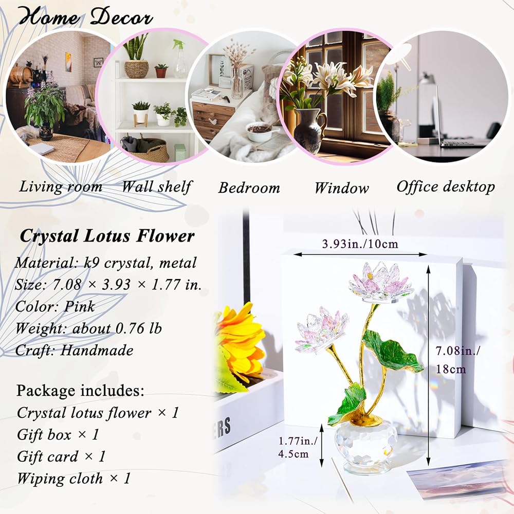 Perfect Size: Crystal Lotus Dimensions :7.1 x 3.95in. Net weight 344g(0.76lb). With enough weight at the bottom, it is suitable for any desktop, windowsill, shelf or desk, easy to clean and maintain, just wipe with a soft cloth (included in the package), and the crystal material is durable and will last for years