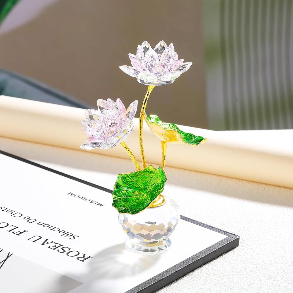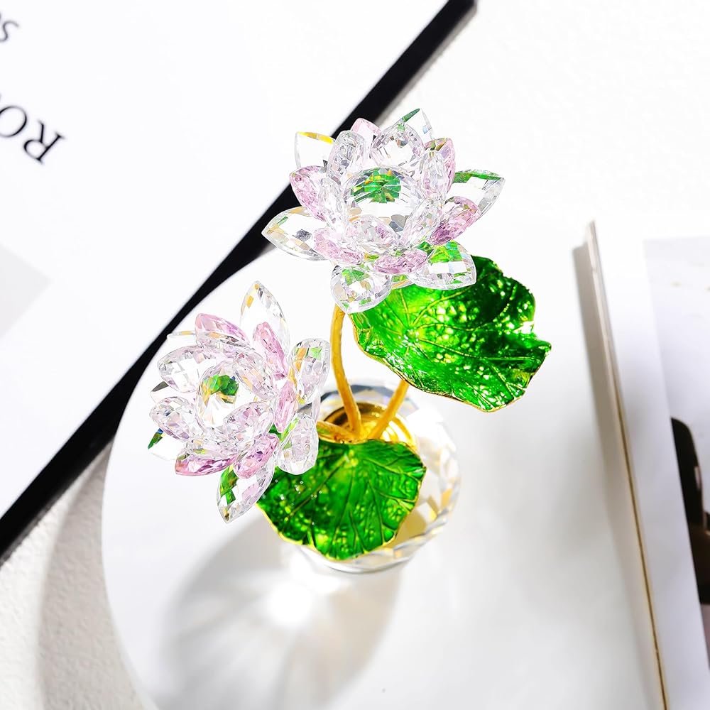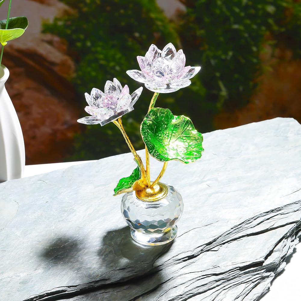 Material: The petals and vases of the lotus are made of K9 crystal, the long stems and green leaves are made of metal, the crystal lotus is handmade and very delicate, and the glass lotus figurines have cut multifaceted petals that appear as beautiful rainbow spots when the sun shines a little on it