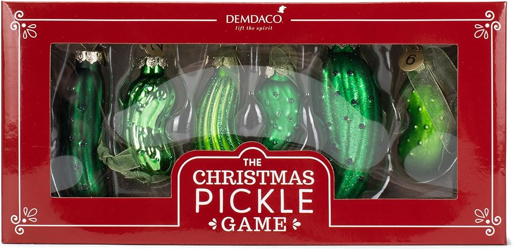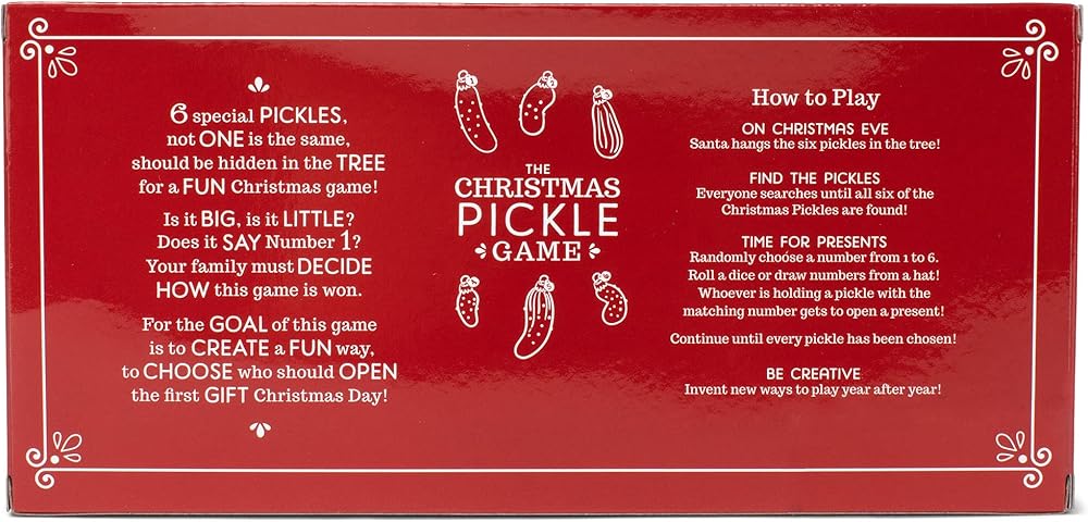 Pickle Decorative Hanging Ornaments Game includes six special pickles with not one the same that can be hidden in the tree for a fun Christmas game; Your family must decide how this game is won; Create a fun way to choose who should open the first gift on Christmas day
