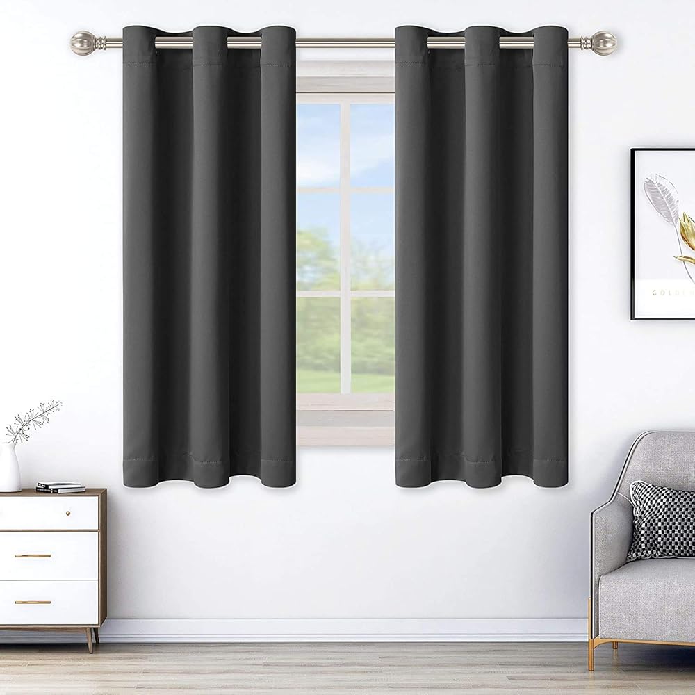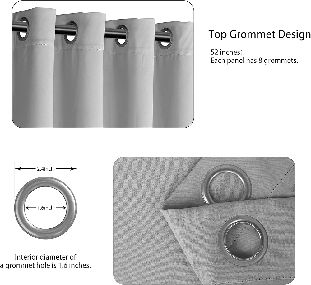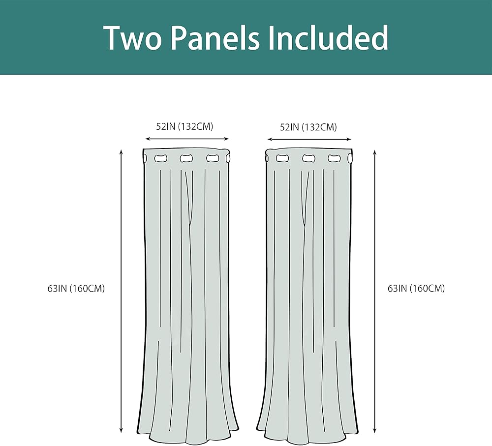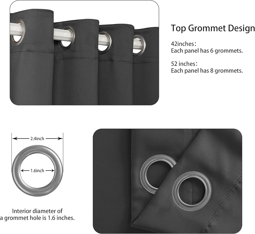 WHAT'S IN THE PACKAGE? Each set includes 2 dark gray blackout curtain panels, and each window drape measures 42-inch width by 63-inch length. 6 elegant silver metal grommets with 1.6-inch inner diameter, fit well with standard or decorative curtain rods, which makes the curtains easy to install and slide.