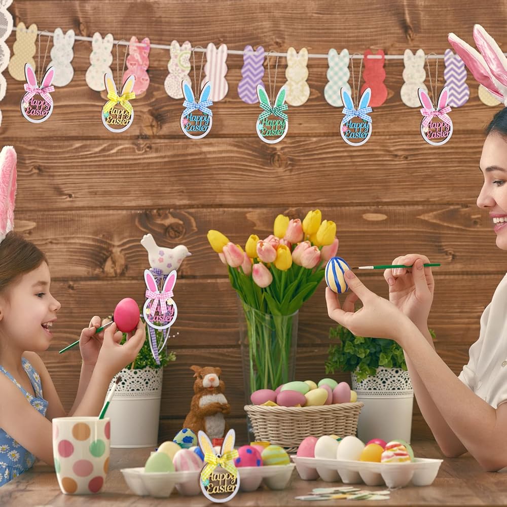 There are holes at the top of the bunny ornaments, combined with the included ropes, you can easily hang them up wherever you want to decorate, such as windows, ceilings and tree branches, convenient and time saving.