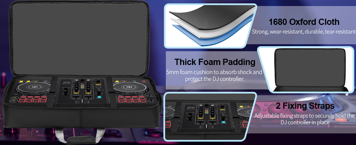 【Full Protection for DJ Equipment】The DJ Carrying Case is full padded with soft thick foam, which can protect your DJ controller and accessories from bumps, scratches or other damages while transport. 2 adjustable fix belts in the DJ Roller Bag are used to tight the dj controller, avoiding shaking and other damage during transport.