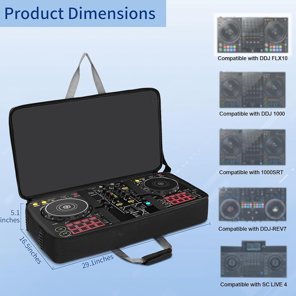 【DJ Controller Case】The DJ Carrying Case has internal dimensions of 29.1 * 16.5 * 5.1 inches. Please check the size of your DJ Controller before purchasing. DJ Controller Case is compatiblle with FLX10 / DDJ 1000 / 1000SR / DDJ-REV7 / DDJ-REV5 / SC LIVE 4.