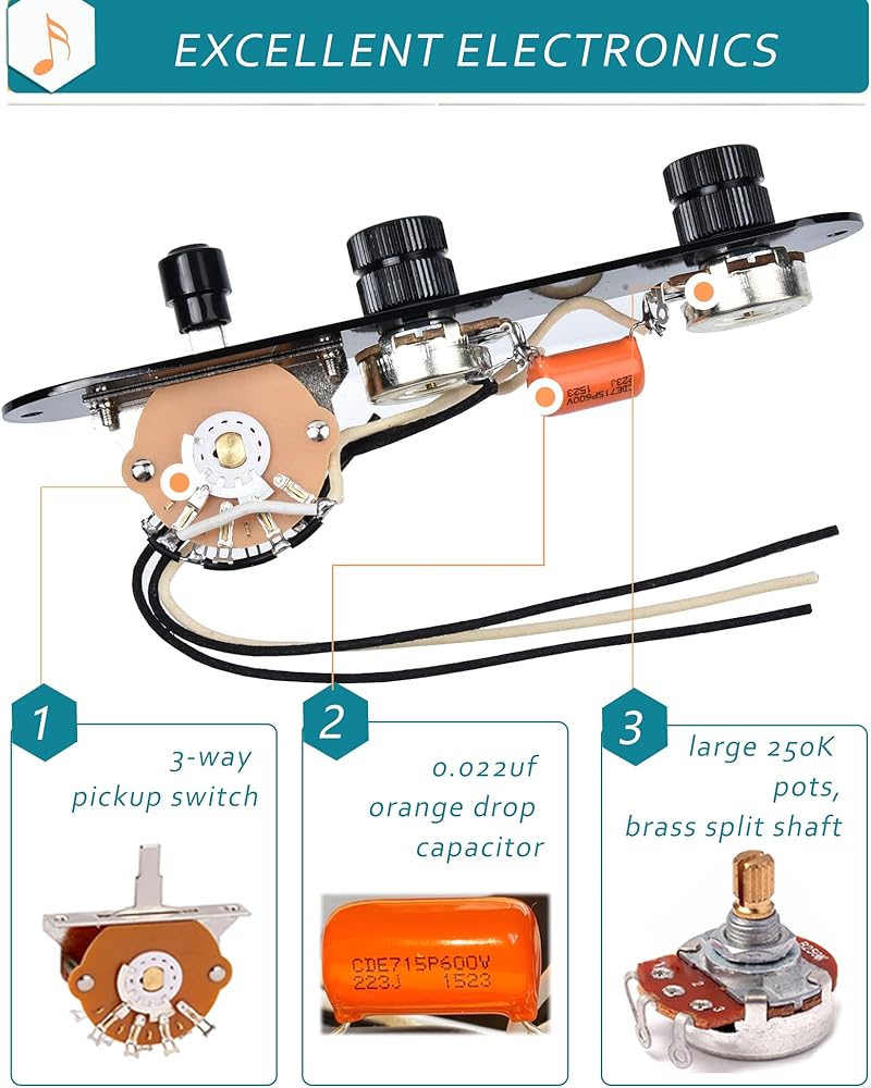 𝙌𝙐𝘼𝙇𝙄𝙏𝙔 𝙎𝙒𝙄𝙏𝘾𝙃 𝙋𝙇𝘼𝙏𝙀 - all wiring elements were pre-wired - Alpha A500 kΩ tone and volume Pots in split shaft - full 1/4 size, smooth 3-way blade pickup selected switch, 0.022 uF orange capacitor,