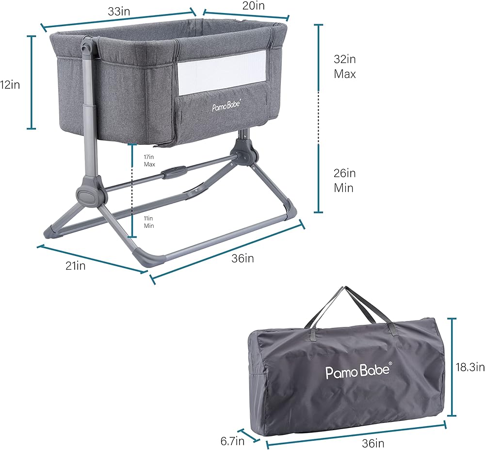 【Designed with mothers in mind】Pamo Babe Bedside Bassinets with Two-side breathable mesh sidewalls and zipper design makes it easier to care for baby from bed. Dimension of the bassinet is 36 L*21 W*32 H(max) inches.