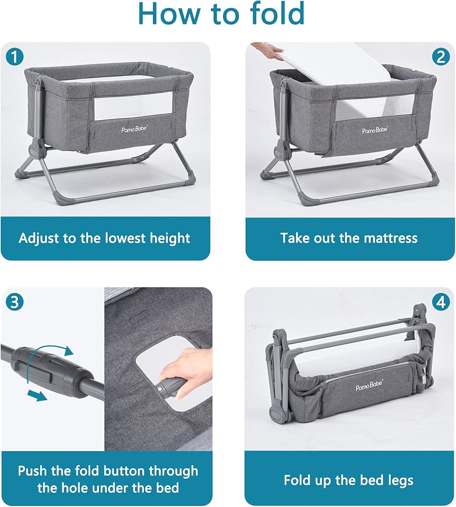 【Quick Fold】The bedside bassinet can be folded with only one step. Dimensions after folding is 6.3'' *35.8'' *17.7'' .