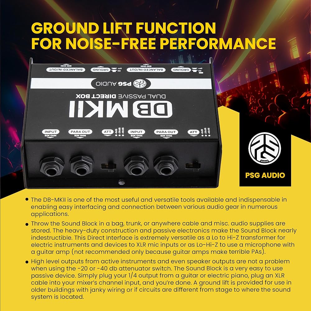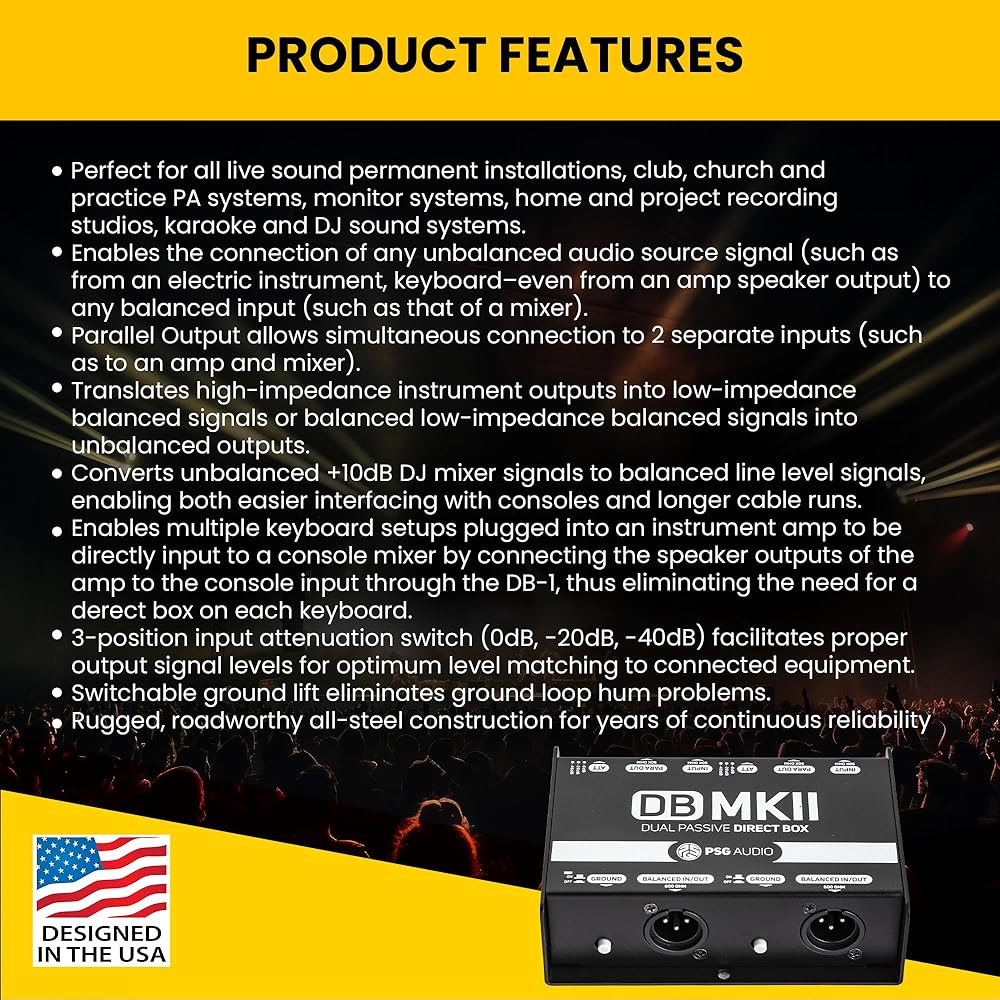 ✅Enables multiple keyboard setups plugged into an instrument amp to be directly input to a console mixer by connecting the speaker outputs of the amp to the console input through the DB-MKII, thus eliminating the need for a direct box on each.