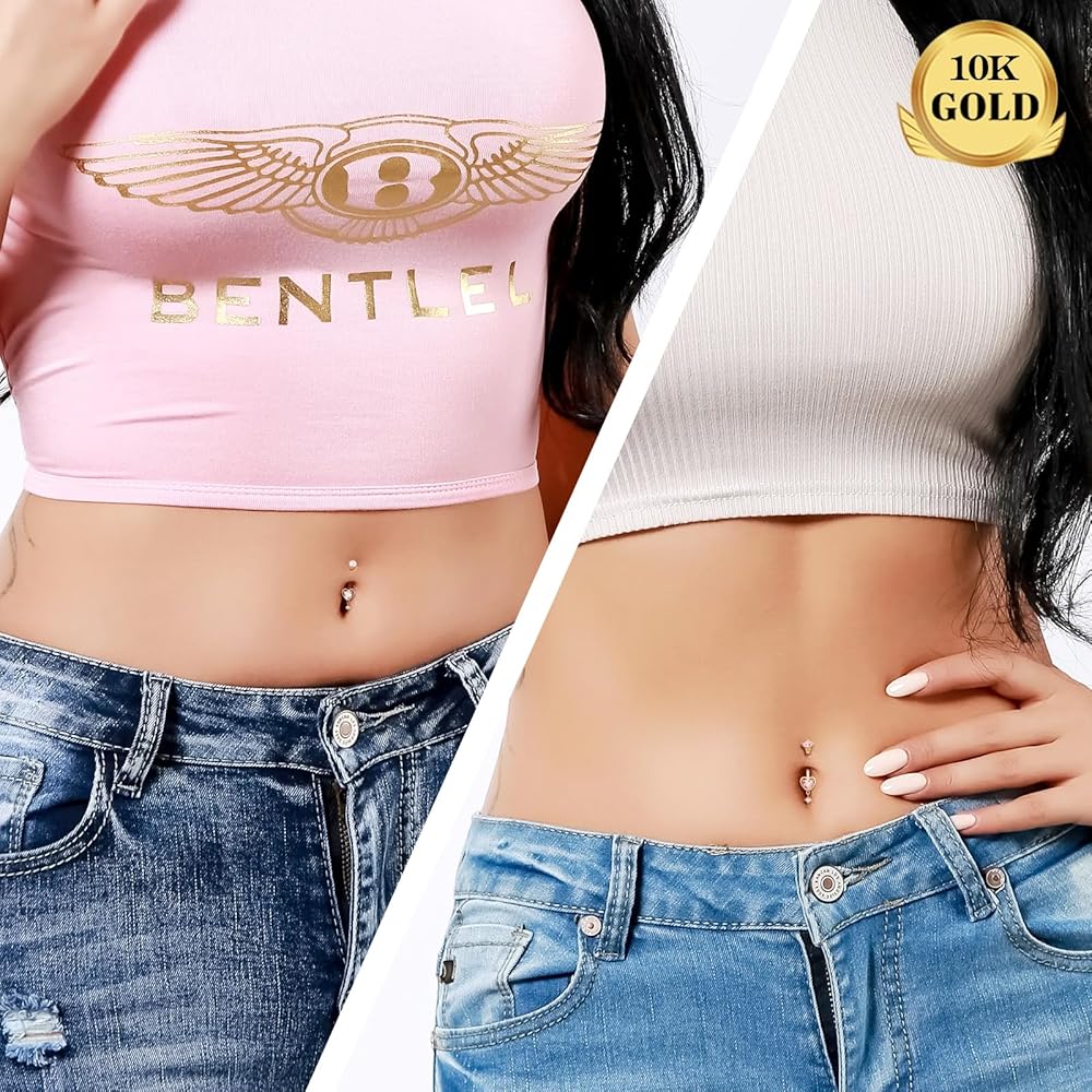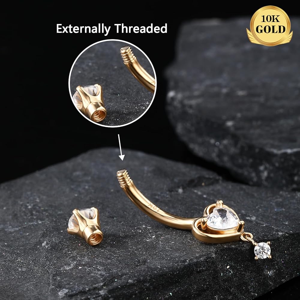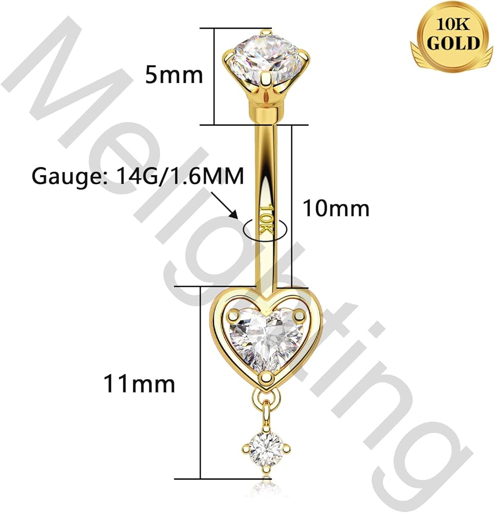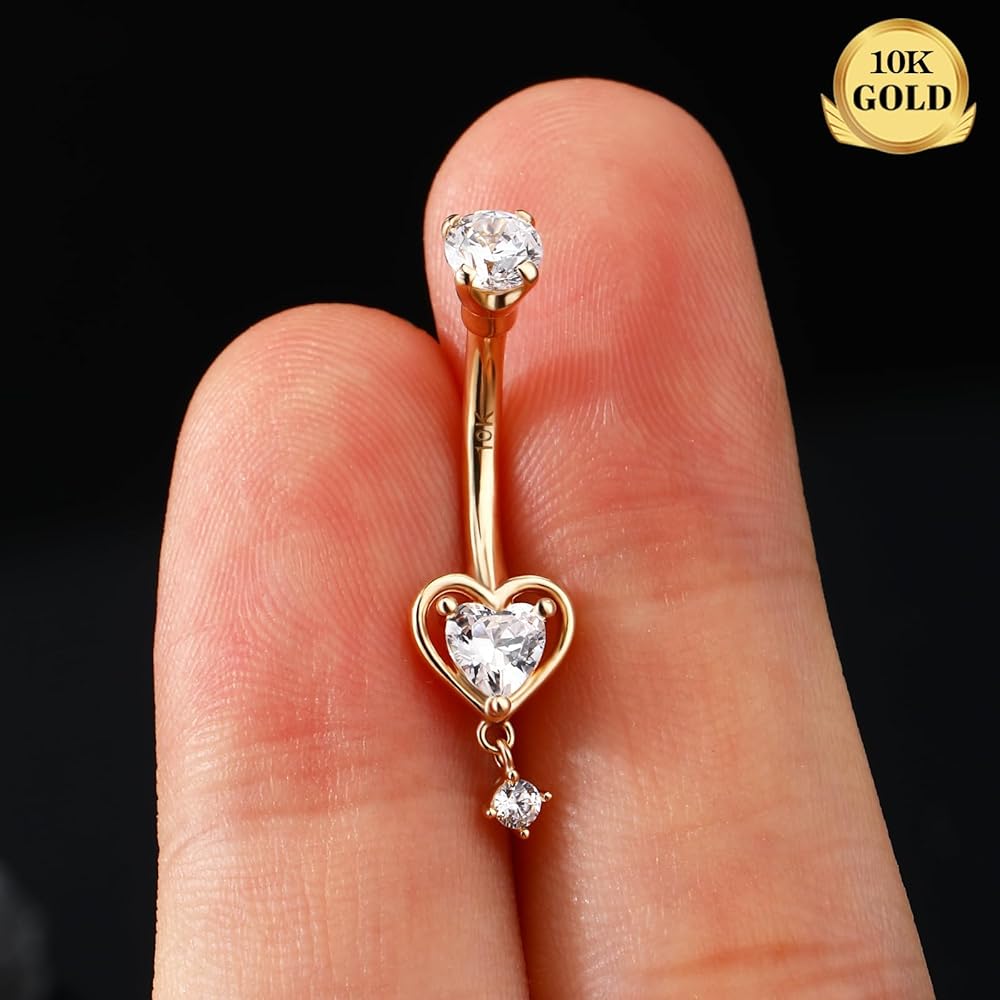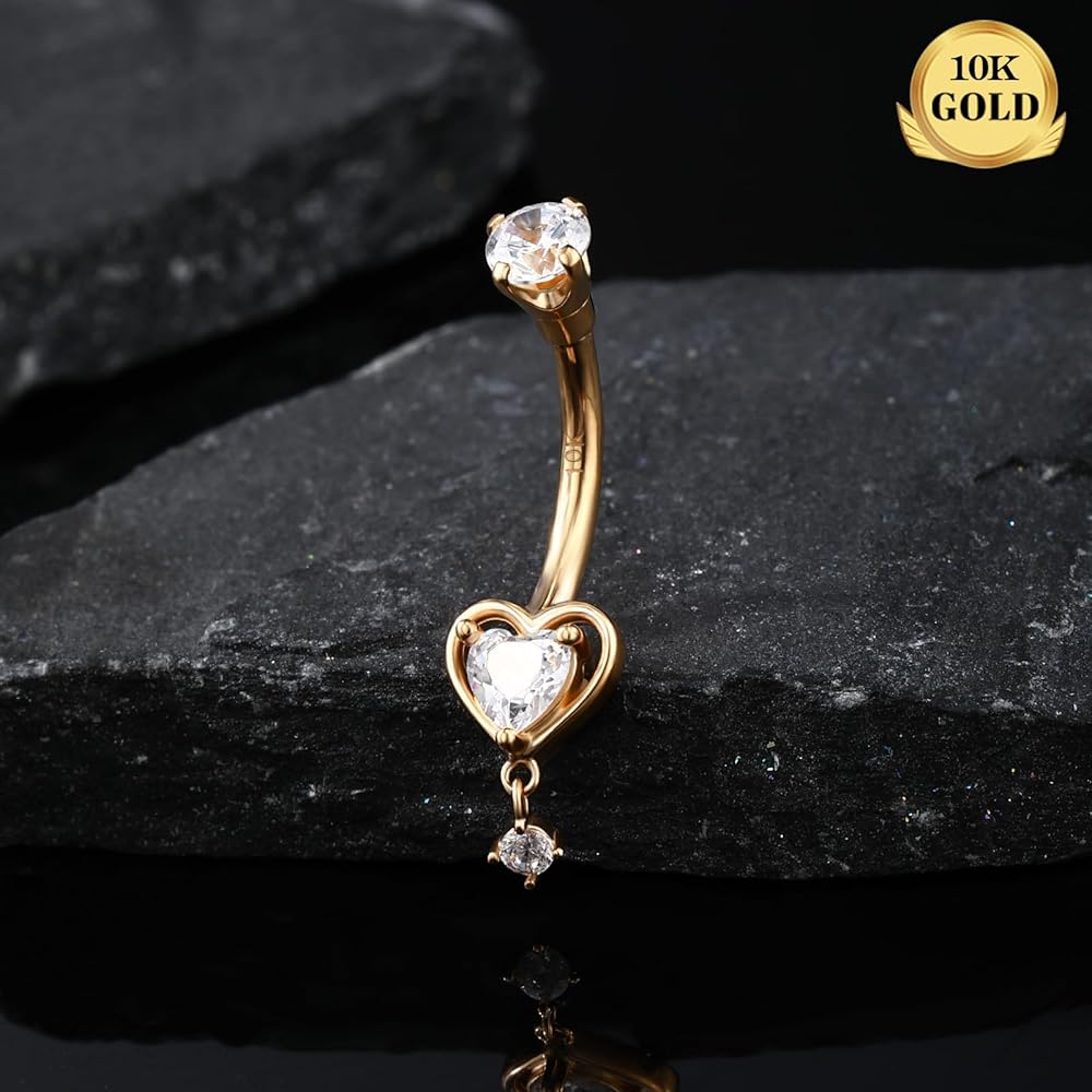 Gold Belly Button Ring: One Order Include 1pc 14K Solid Gold Heart Dangle Belly Ring CZ Shaped For Women and Girls. Gauge of Belly Button Ring: Bar Thickness: 14G/1.6mm; Bar Length: 10mm, Comfortable Size for Belly Piercing. Solid Gold Belly Ring: Made with 14K Gold - NOT Gold Plating or Overlay. the Most Safety Materials for all Types of Skin. Hypoallergenic and Nickel Free, Suitable for Daily Use. 0 Harm to your Skin, even New Piercing Can Use it. Gold Belly Piercing Jewelry: Dangle Heart Design adds Sophistication to the Gold Belly Ring, Give You More Charming Look! High Polished Surface, Safety & Comfortable, Suitable for Different Daily Outfit. Excellent Gift for Women: The Belly Ring can be Used a Great Gift for Your Friends or Family, It is Suitable for Concert, Anniversary or any other Occasions, Such as Halloween, Valentine's Day, Christmas Day, and soon