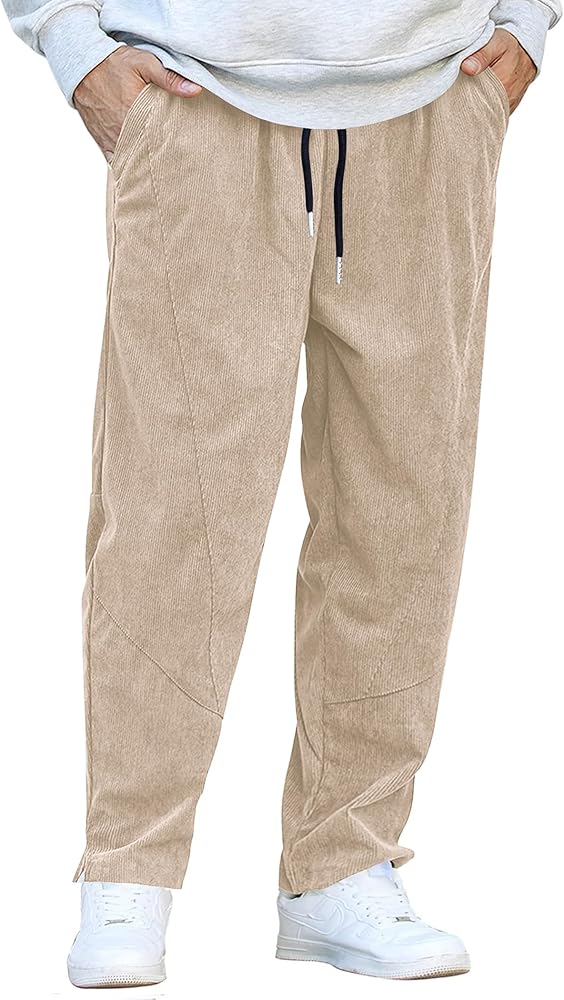 Elastic Waist Drawstring & Wide Leg -- The loose corduroy pants features stretchy waist with drawstring provide the maximum comfort at your waist, four deep pockets can carry you essenitals, casual/wide legged pants offer a lot of room to move and are perfect for guys that just want to relaxed and chill.