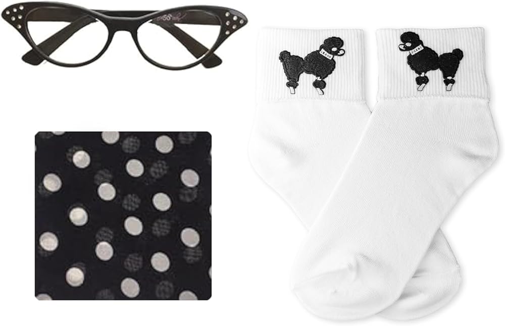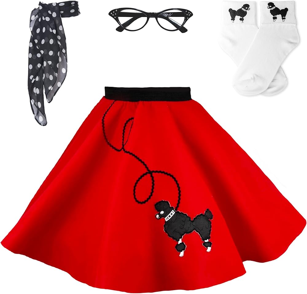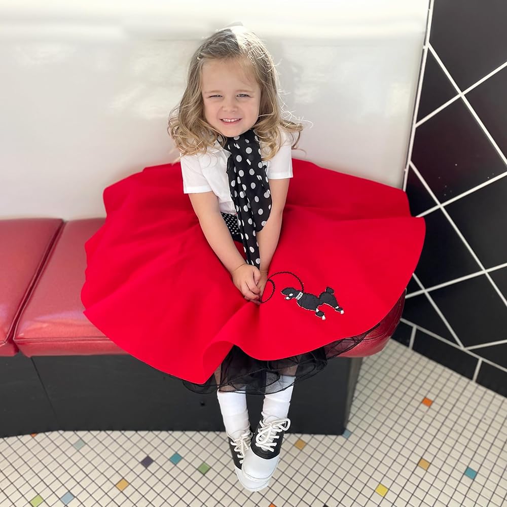 When your daughter wears this 1950s-inspired costume, she'll want to do the doo-wop, the bop, and the jive! It comes with a poodle skirt, scarf, bobby socks, and cat-eye glasses. The poodle skirt is made from 100% acrylic felt and features an applique of a black poodle. A twisting and looping leash is embroidered onto the skirt for a fun, authentic retro look. The skirt also has an elastic waistband that will stretch with ease, making it super comfortable. Each skirt is handmade by local seamstresses right here in the USA! They hand-cut the skirts and add on the appliques themselves. The scarf can either be worn as an ascot or a hair accessory. The scarf is made from chiffon, so it will feel lightweight on your little one's neck. The bobby socks come in white and also have a poodle applique sewn onto their cuffs. Finally, the cat-eye glasses have sparkling rhinestones embedded into the frame. The lenses are made from impact-resistant plastic, so you'll be able to enjoy them for years to come. You can choose from 6 different color schemes, including black, hot pink, light pink, purple, red, or teal. Pick from 3 different sizes, including small, medium, or large. The sizes range from children's 4 to 12. The skirts are made especially for little girls. Order one for the next sock hop, swing dance, decades dance, or themed party. Your daughter will be the belle of the ball when she wears this outfit! She can also wear it as a Halloween costume. Hip Hop 50s is a local business based in the