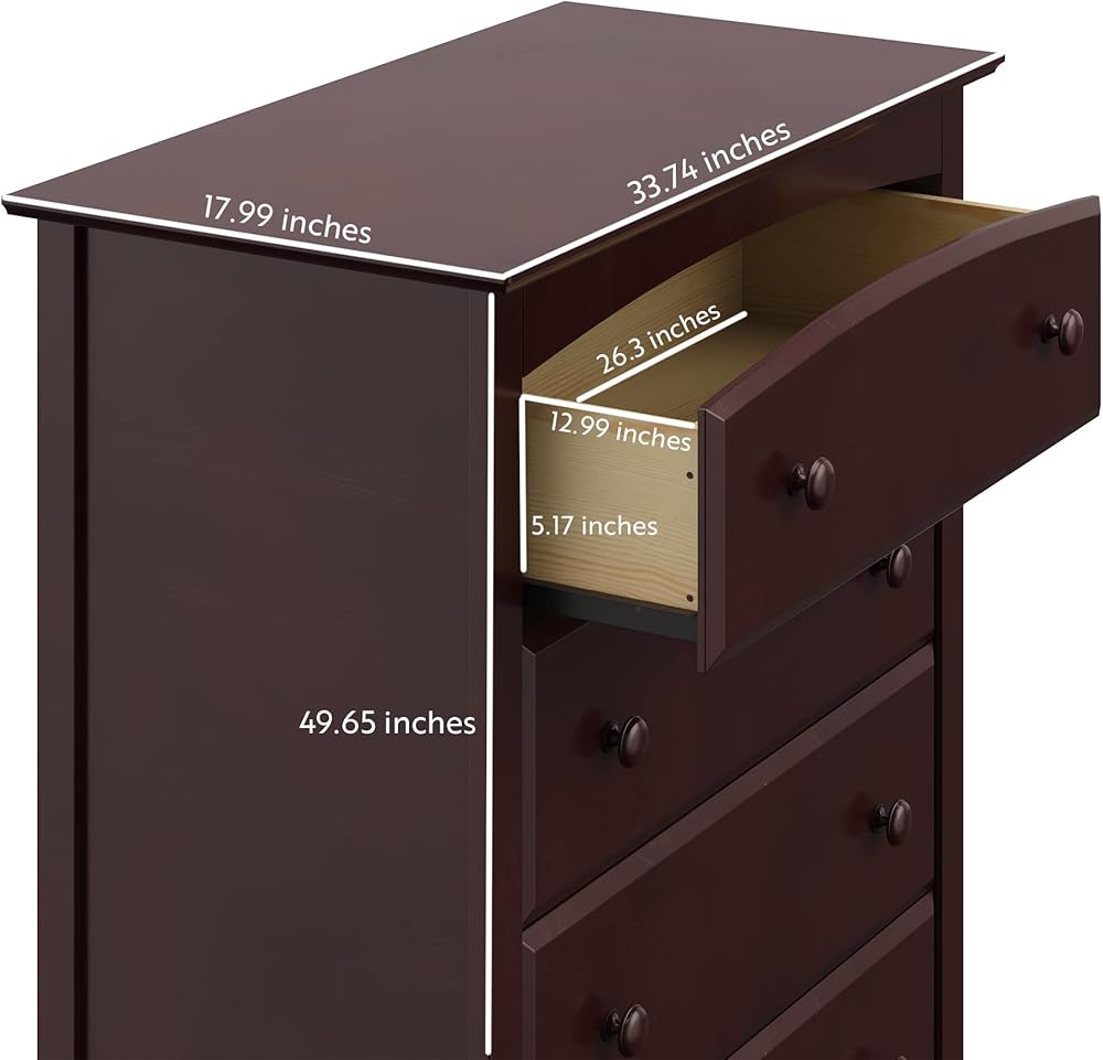 NURSERY AND KIDS BEDROOM DRESSER: Nursery and kids dresser for bedroom with 5 drawers; Universal design easily matches any bedroom; Crafted of wood framing and wood composites, and includes Euro drawer glides; Assembly required; Anti-tip kit included