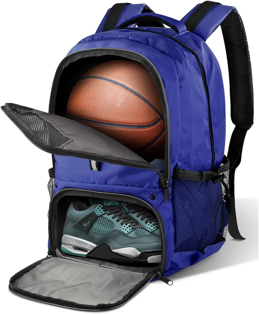 Excellent Design:Ball and shose compartment design with vents is to keeping the air circulating, Can prevent dust and odor from soiling the personal compartment.Laptop Compartment fits up to 17.3" laptop.3 side pockets and1 elastic mesh pocket, 1 zipper pockets can hold other personal item