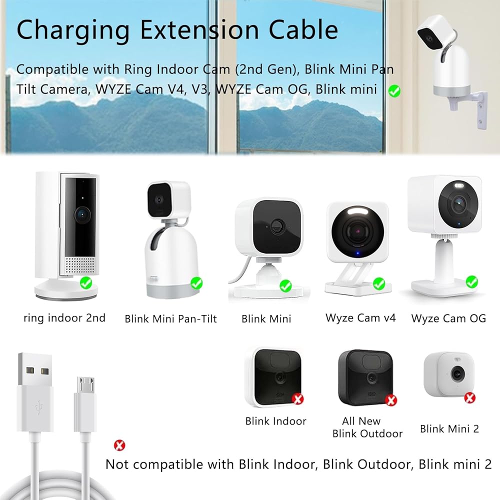 【Widely Compatible】The charging extension cable is compatible with blink mini pan tilt camera, WYZE Cam V4, Ring Indoor Cam (2nd Gen) .
