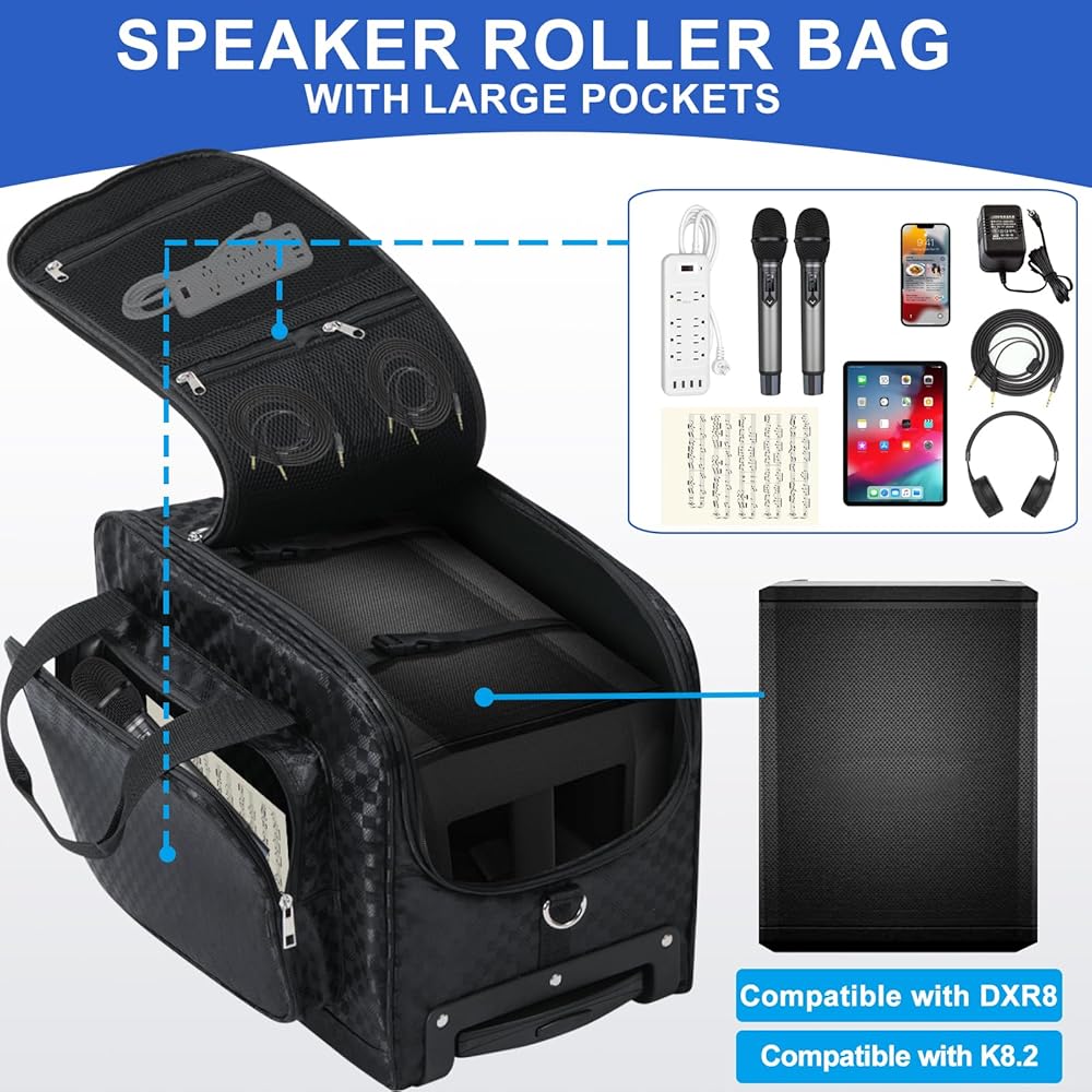 Speaker Bag Soft Padded with Wheels Compatible with QSC K8 / K8.2 / PartyBox On The Go/Spark Live / IRX108 / Authentics 500, Rolling Speaker Soft Case Roller Bag with Multi-pocket & 2 Fix Straps