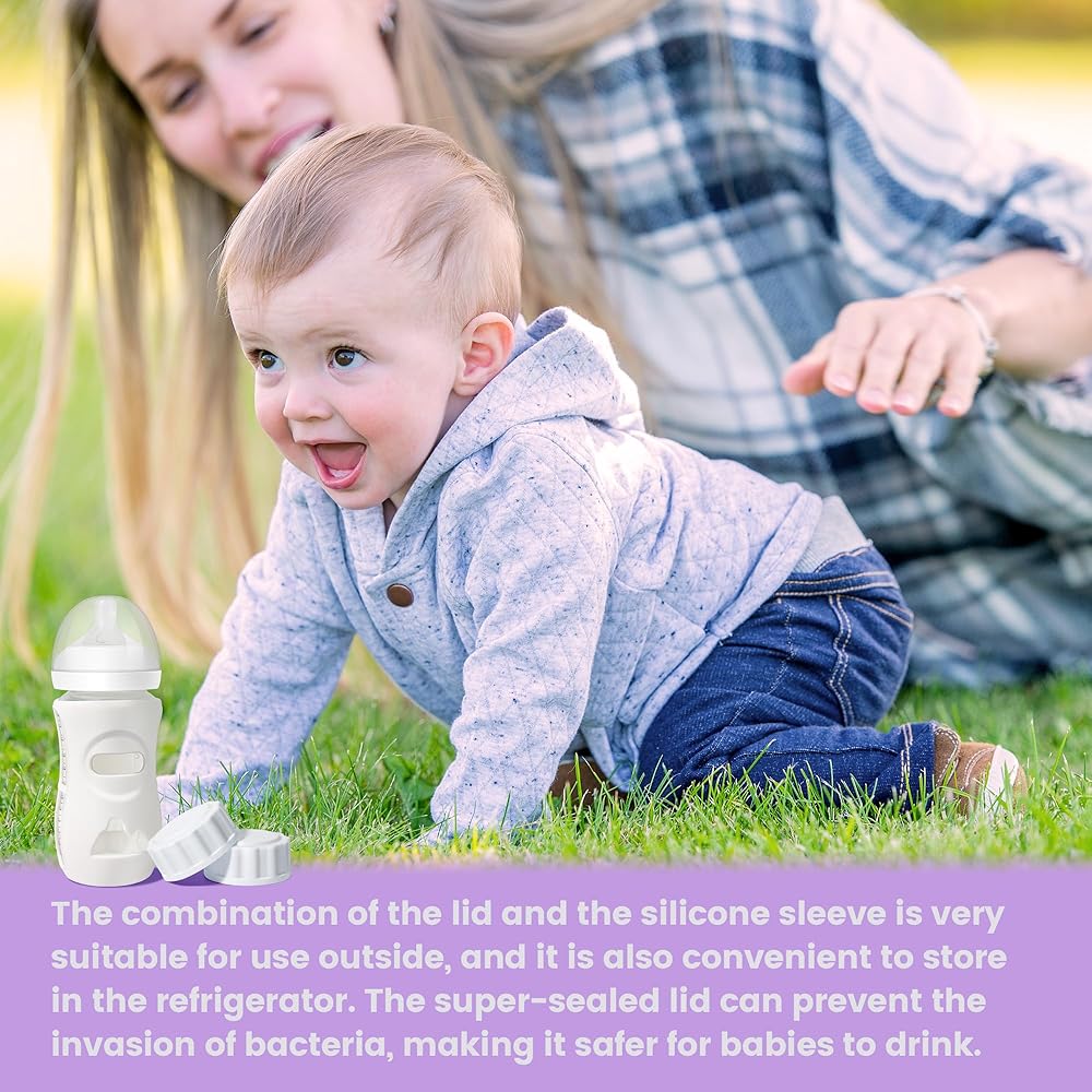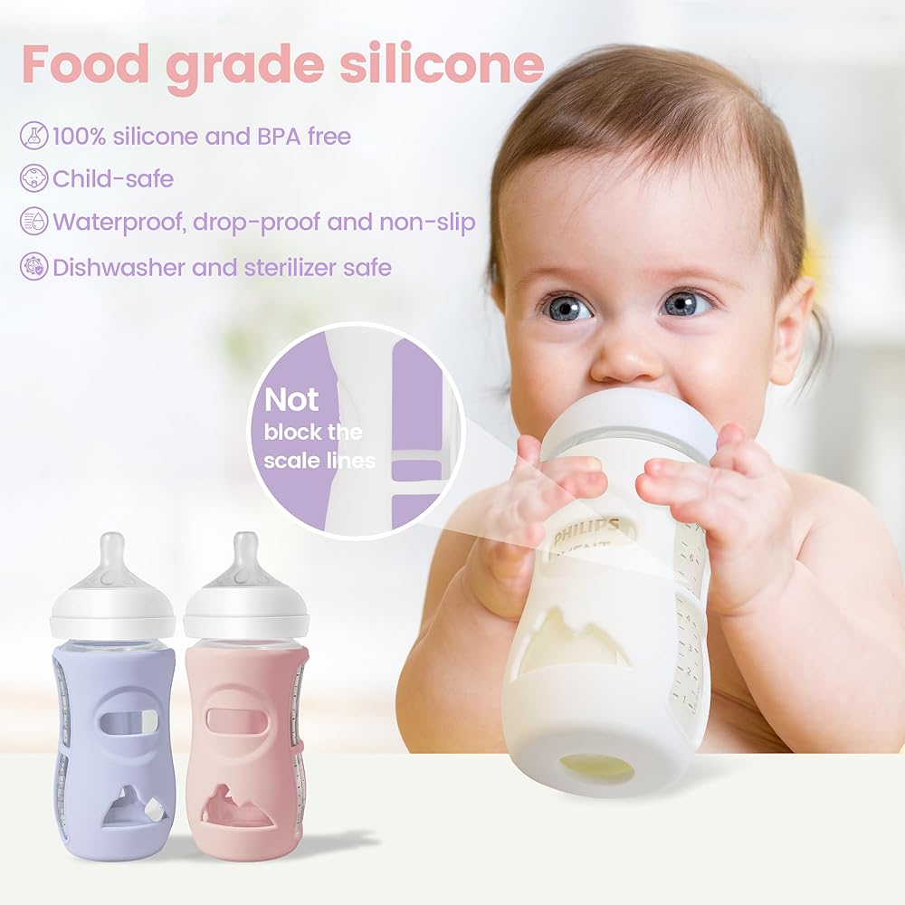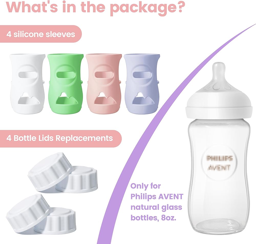 Package includes: Package includes 2 white, 1 blue, 1 green silicone bottle sleeves and 4 Bottle Lids Replacements. These bottle sleeves and lids are dishwasher and sterilizer safe, and the high quality silicone material ensures long term use. Only suitable for Philips AVENT Glass Natural Baby Bottle 8 oz