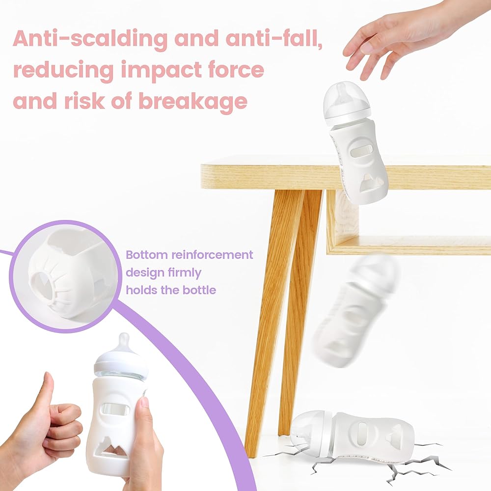 Anti drop, anti slip and heat insulation: This silicone sleeves can protect against bumps and scratches. It provide stronger protection to prevent the bottle from breaking when dropped. Joxodax baby bottle holder also has good heat insulation and easy to remove from the heater, It can provide some insulation during cold weather