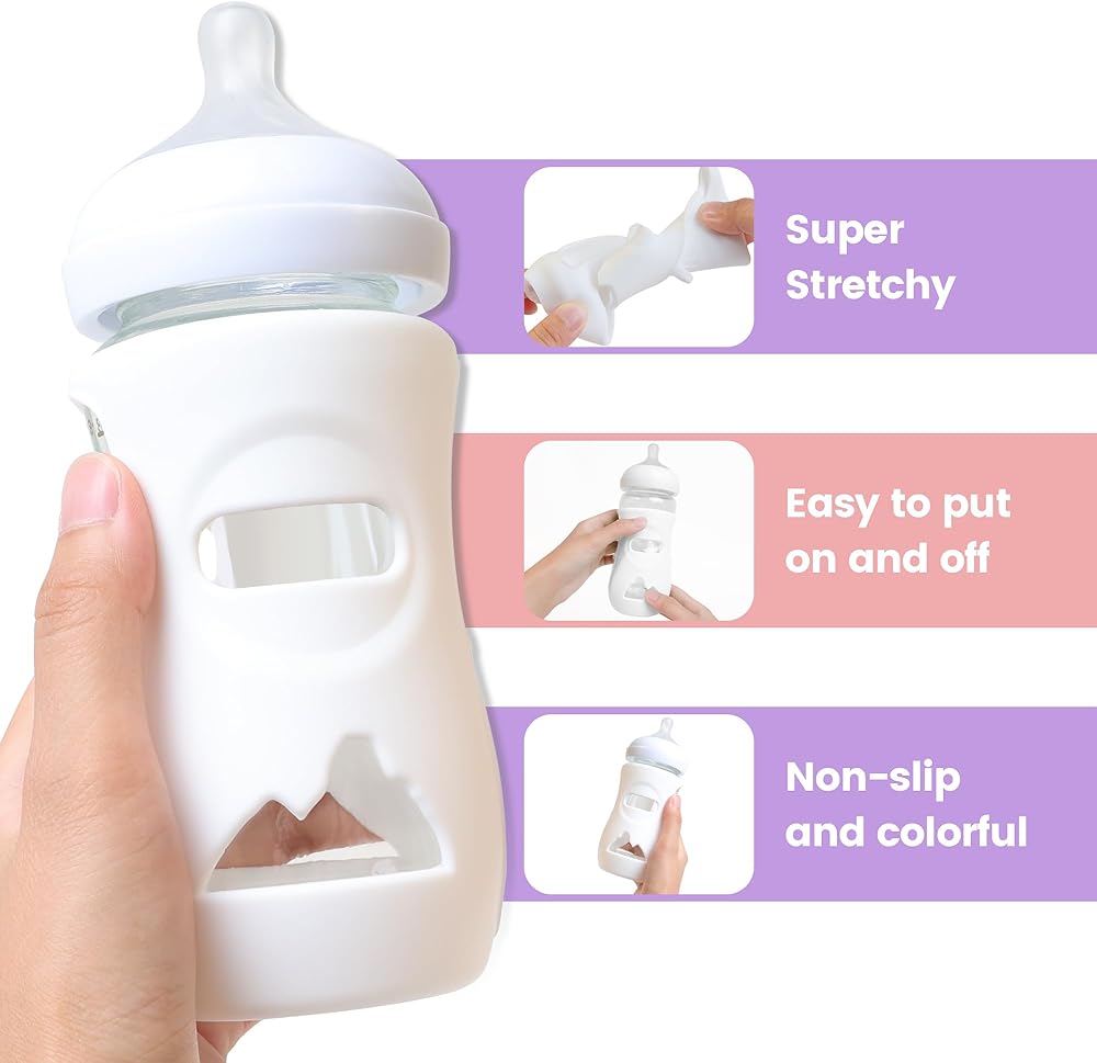 Easy to hold and Comfortable feeding: The colorful silicone sleeve helps baby to hold it, and the scale lines will not be blocked, so you can easily see how much milk is left. The smooth and soft silicone material is specially designed for babies, so they can learn to feed themselves faster