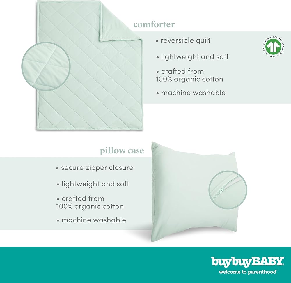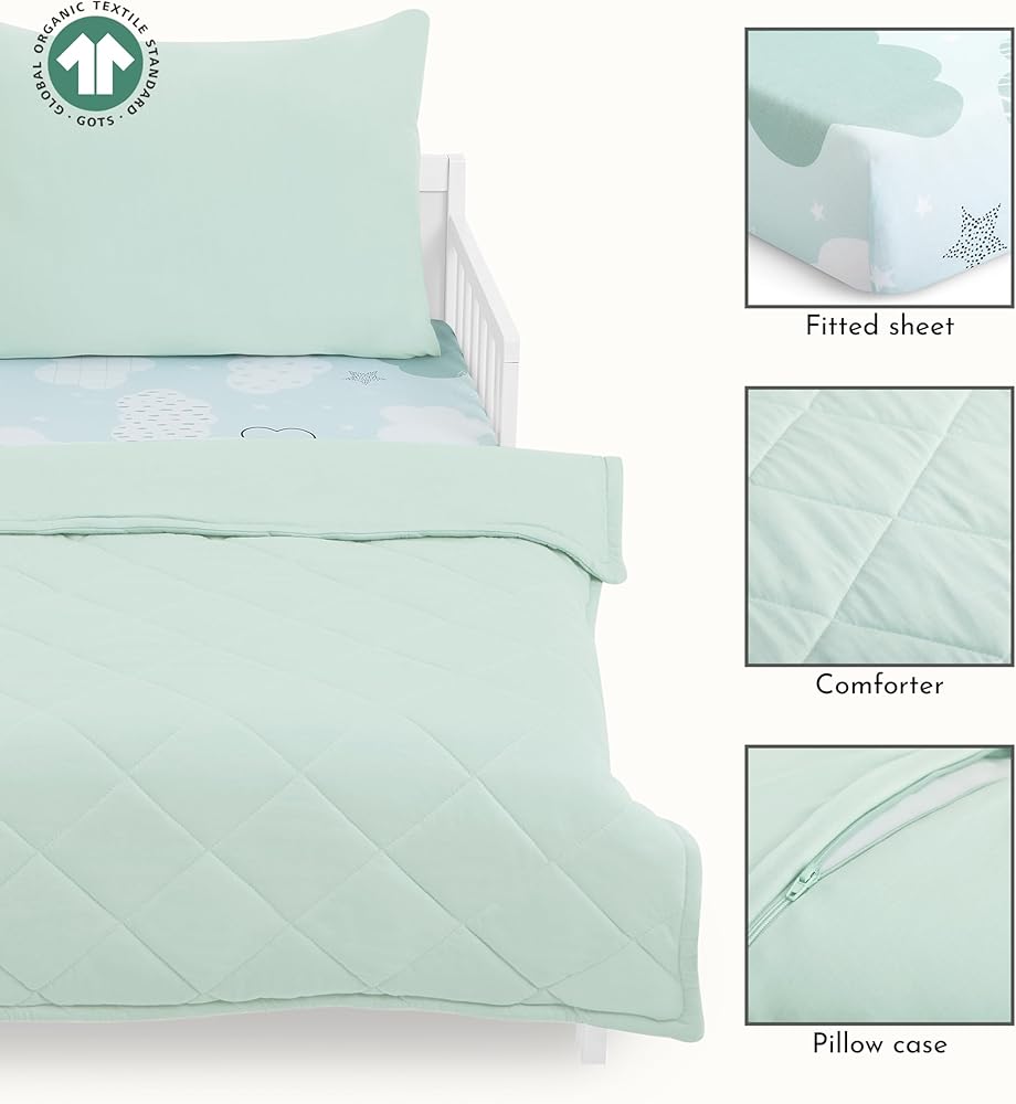 COMPLETE COMFORT: This set includes a pillowcase designed with a zipper for added safety, a comforter, and fitted sheet. Crafted from 100% organic cotton, GOTS certified & packaged with zero-waste, this toddler set is a must-have.
