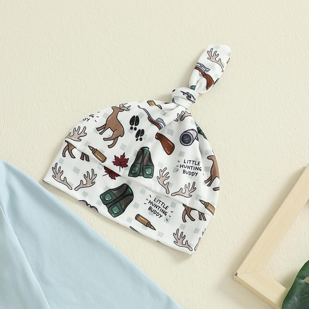 Design: 3Pcs newborn baby boy girl coming home outfits, hunting romper with long sleeve crewneck,Daddys Hunting Buddy letter print, and elastic waistband pants and hat all with all-over elk print, versatile and energetic.