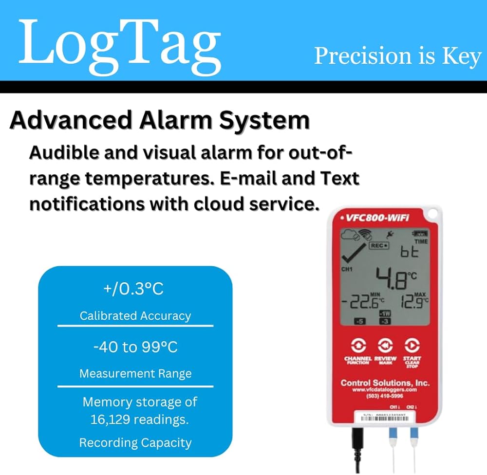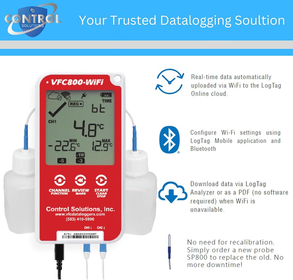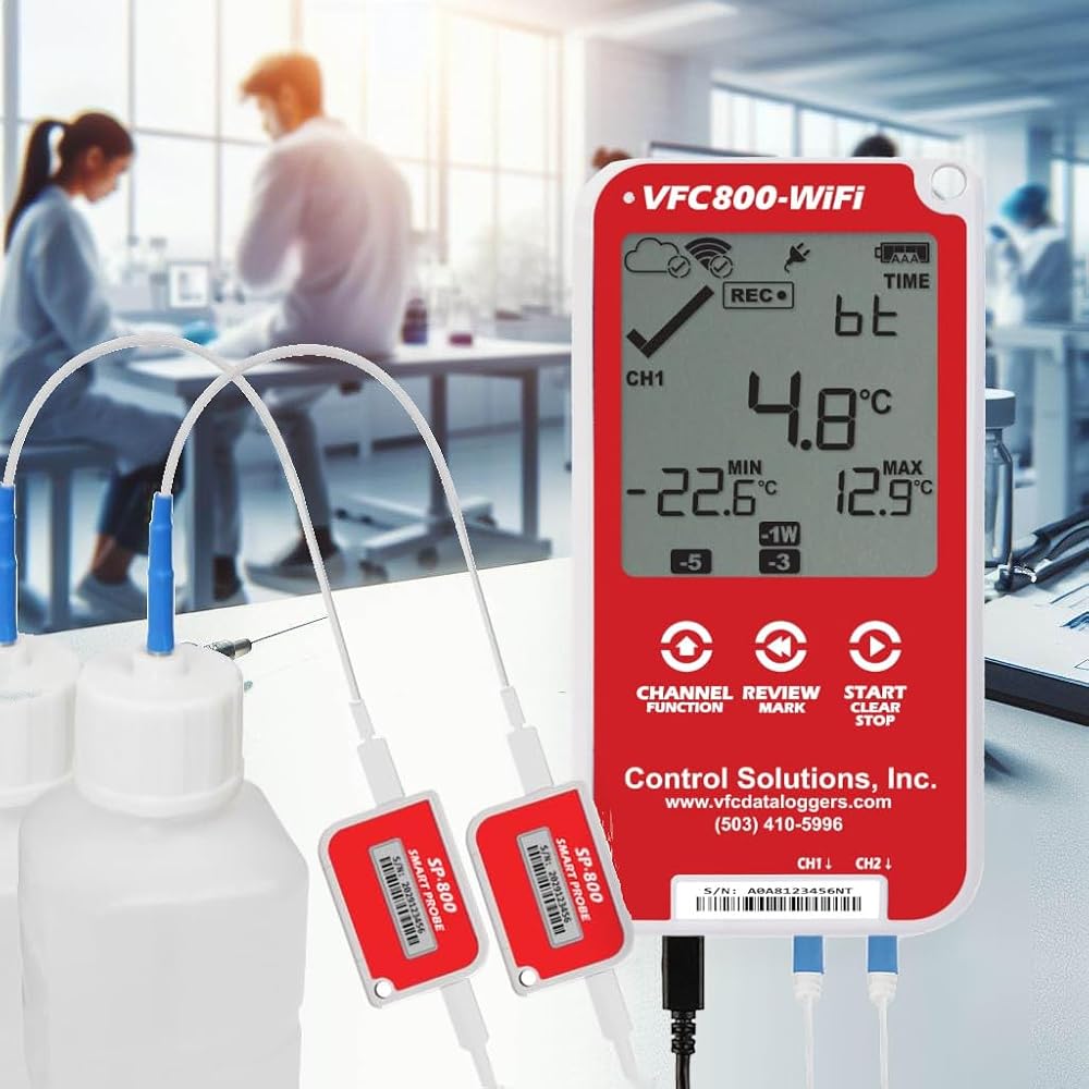 Ensure Precise Vaccine Storage with the VFC800-WiFi-2 10ft Probe Vaccine Monitoring KitWhen it comes to the safe and accurate storage of vaccines, precision is paramount. Introducing our comprehensive VFC800-WiFi-2 10ft Probe Vaccine Monitoring Kit, equipped with Smart Probe technology to provide you with the confidence and peace of mind you need.What's Included in the Kit:VFC800-WiFi Data Logger: The heart of your monitoring system, offering real-time data and 24/7 alerts.Two Smart Probes: Dual functionality for fridge and freezer monitoring, ensuring the integrity of your vaccines.Two-Year NIST Traceable Certificate of Calibration: Compliant with ISO/IEC 17025:2017 standards for precise measurements.30ml High-Density Plastic Glycol Buffer Bottles: Shatter-proof and efficient, maintaining temperature accuracy.Acrylic Stand (P/N AS-1031): A sturdy base for secure placement.Installation & Mounting Kit: Includes a wall mount bracket for easy setup.Mini USB to USB Cable (6'-6" length): Ensures seamless connectivity.120 VAC USB Adapter: Convenient power source.Two AAA Batteries (Installed): Ready to use upon arrival.2-Year Warranty: Your investment is protected for peace of mind. With our VFC800-WiFi-2 10ft Probe Vaccine Monitoring Kit, you'll have everything you need to maintain the precise temperature control required for vaccine storage. Trust in our technology, backed by a two-year warranty, and ensure the safety of your valuable vaccines. Don't leave vaccine storage to chance. Upgrade to the VFC800-WiFi-2 10ft Probe Vaccine Monitoring Kit and experience the ultimate in reliability and peace of mind.