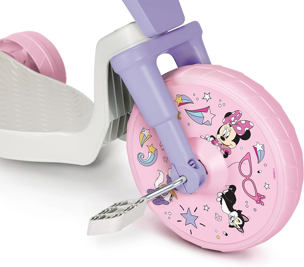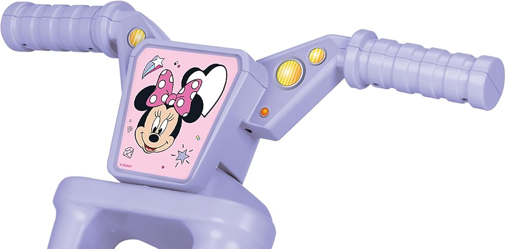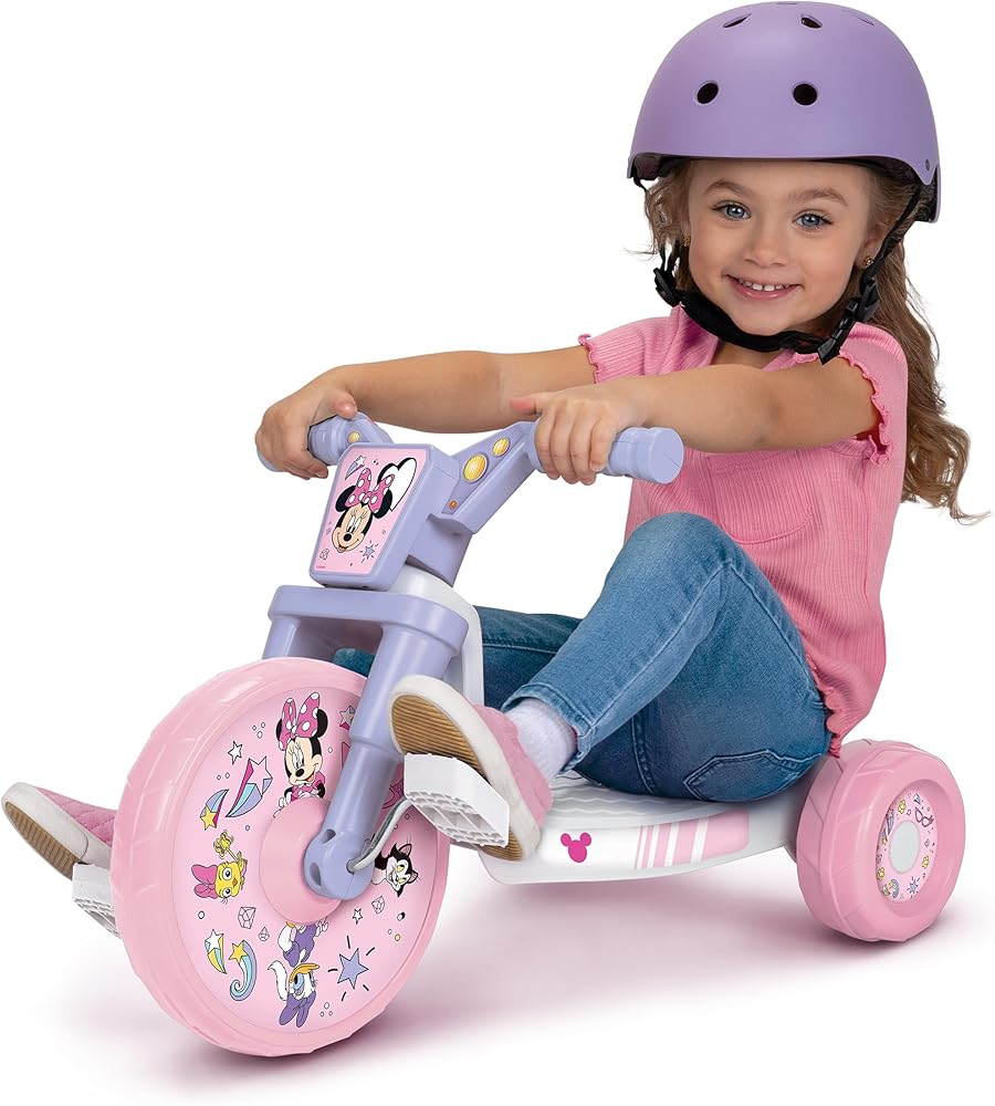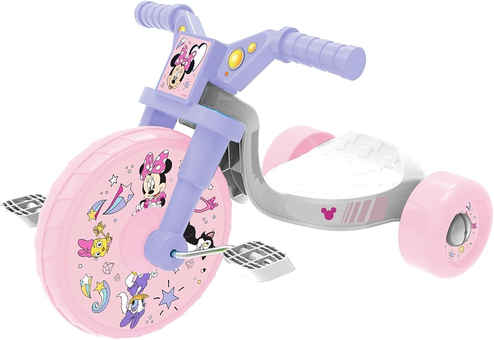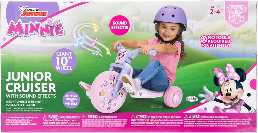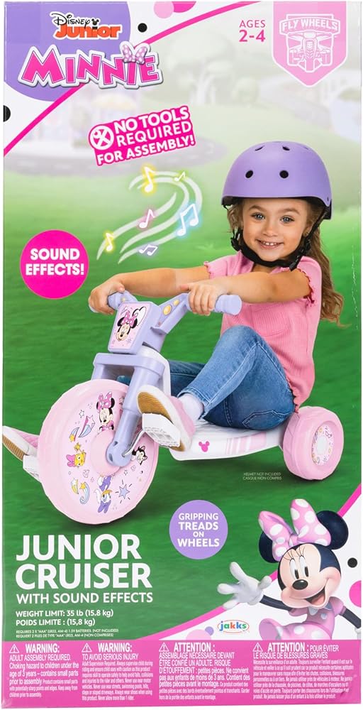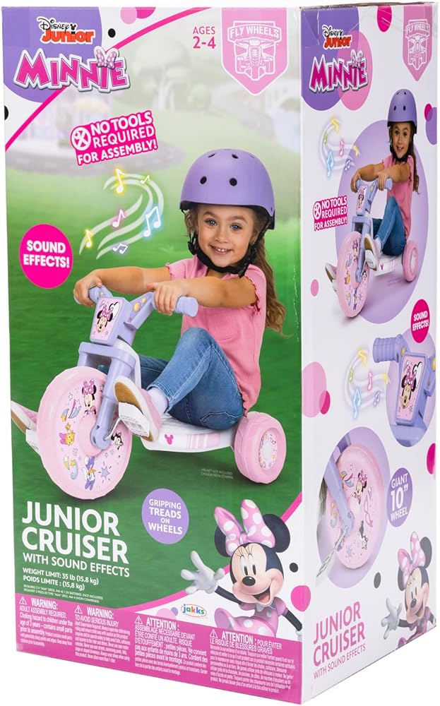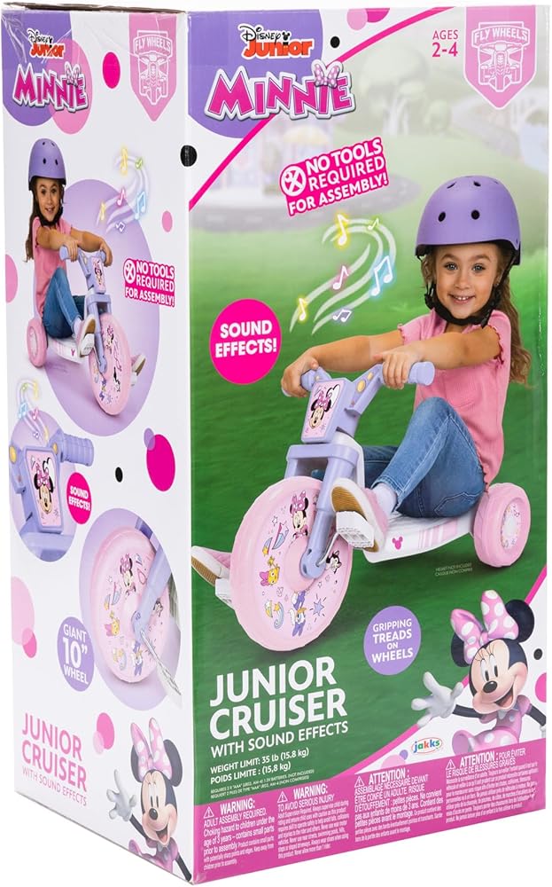 It's time to cruise around with your favorite Minnie Mouse characters on the Fly Wheels™ Junior Cruiser. Featuring an extra-wide front wheel, it's designed for stability and maximum control for toddlers 2-4 years. The Junior Cruiser also includes mega grip tread on wheels for awesome street gripping action, and push buttons on the handlebar that will activate cool sound effects! Redesigned for easy assembly with no tools required, this junior cruiser is perfect for your little one. Happy Riding!