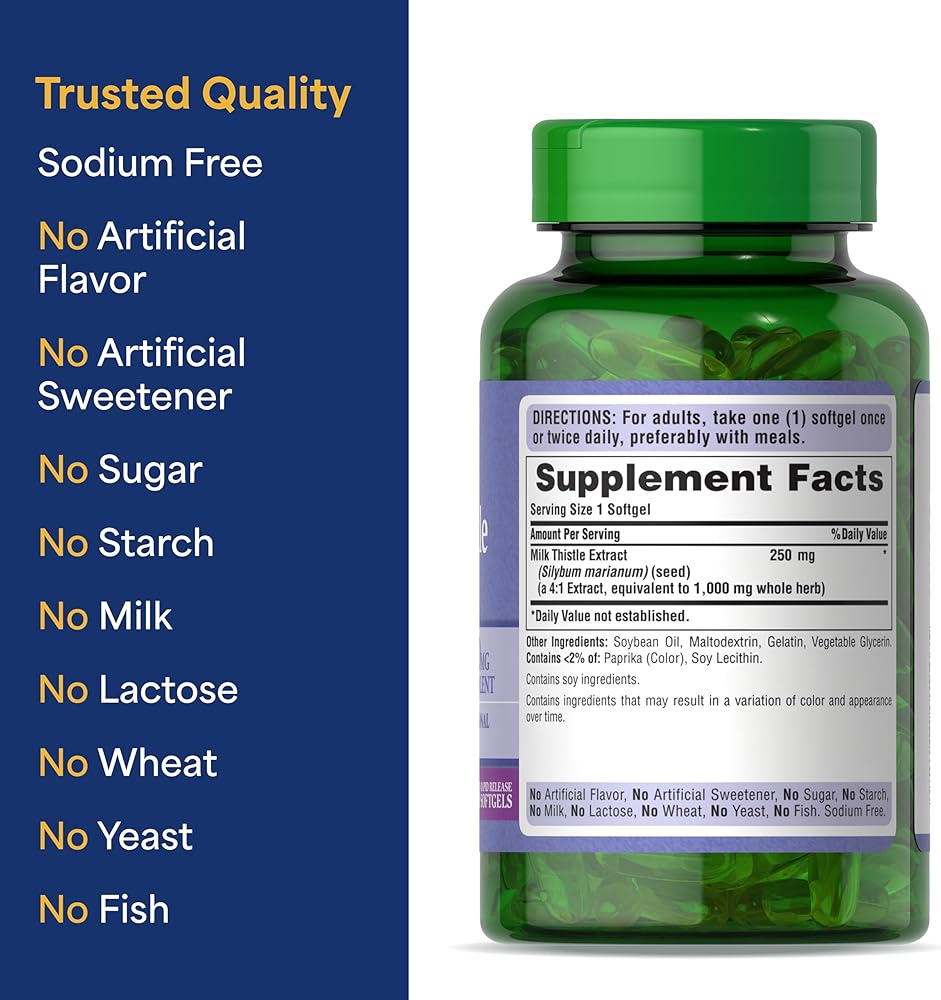 Ingredients: Milk thistle, soybean oil, gelatin, vegetable glycerin. Contains <2% of: natural caramel color, soy lecithin, titanium dioxide color