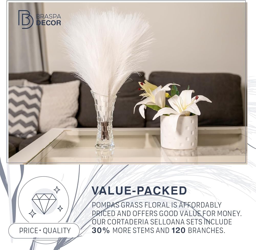 💰𝗩𝗔𝗟𝗨𝗘-𝗣𝗔𝗖𝗞𝗘𝗗: Braspa Decor pampas grass White offers exceptional value for money. Our Cortaderia selloana pampas grass White sets include 𝟯𝟬% more stems and 𝟭𝟮𝟬% more branches, giving you more lushness and volume for your investment.