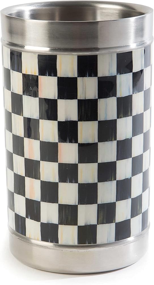 ELEGANT BAR ESSENTIAL: This wine bucket is made of stainless steel with brass handles. It features hand-painted gray-and-white checks woven by an artisan's brush and has a clear enamel coating.