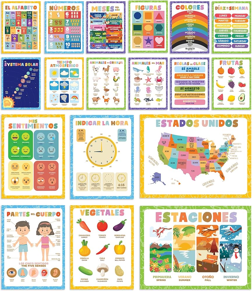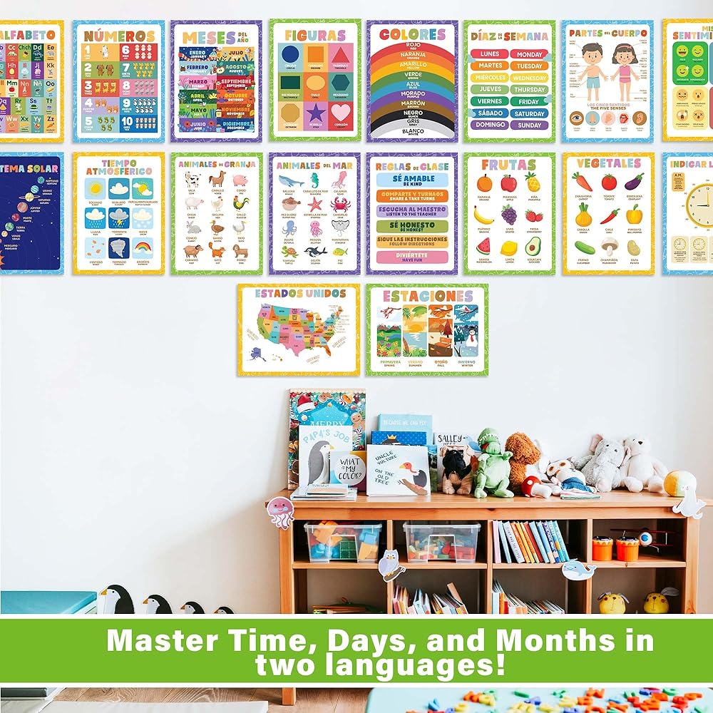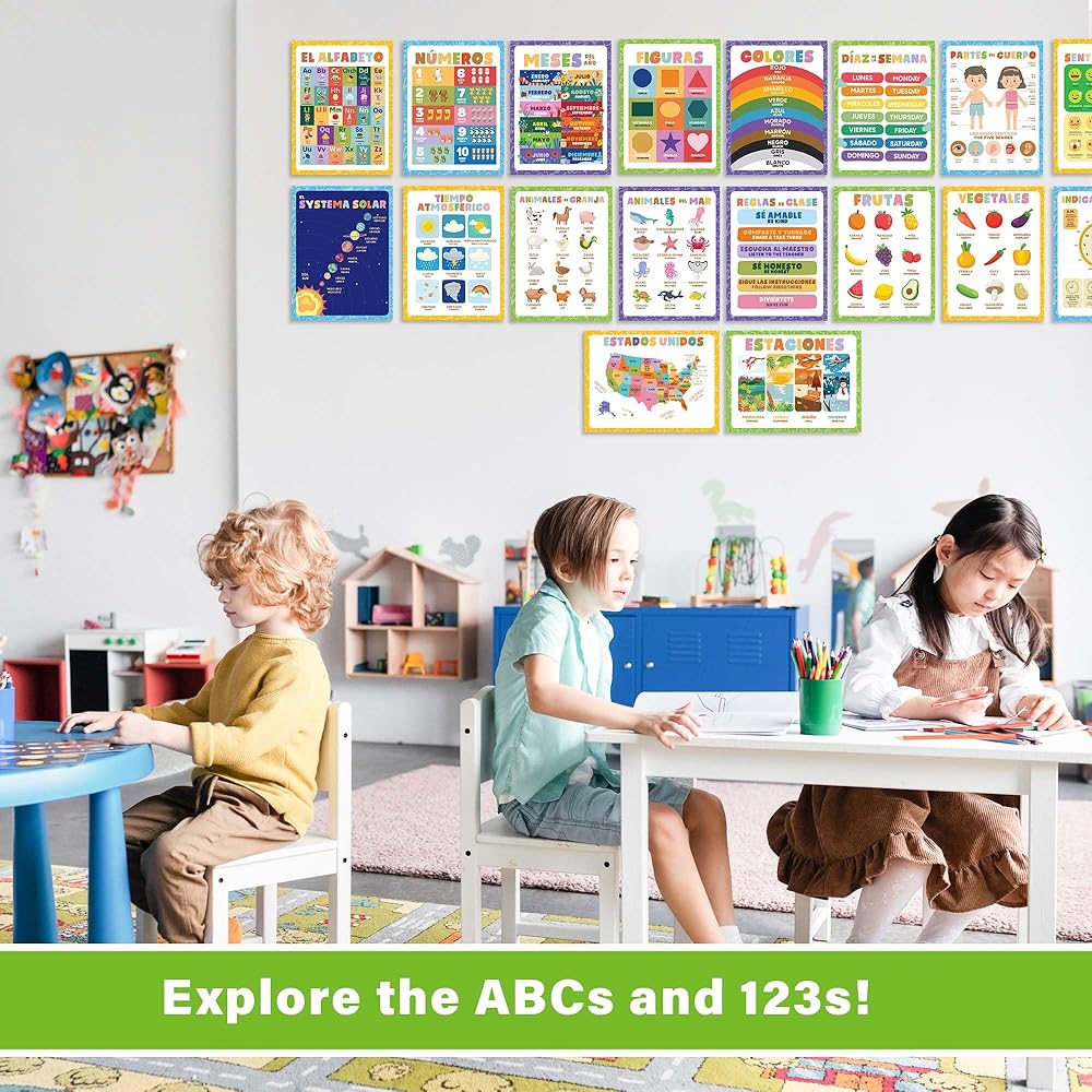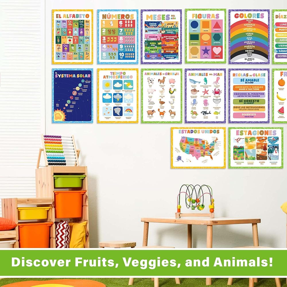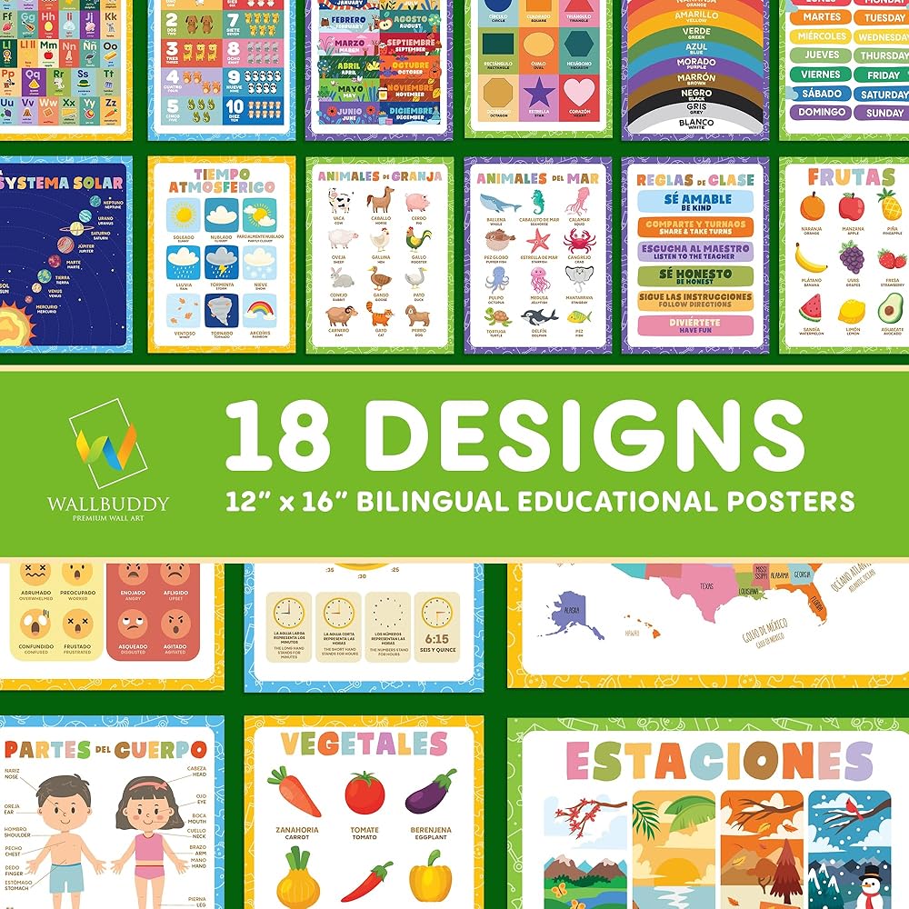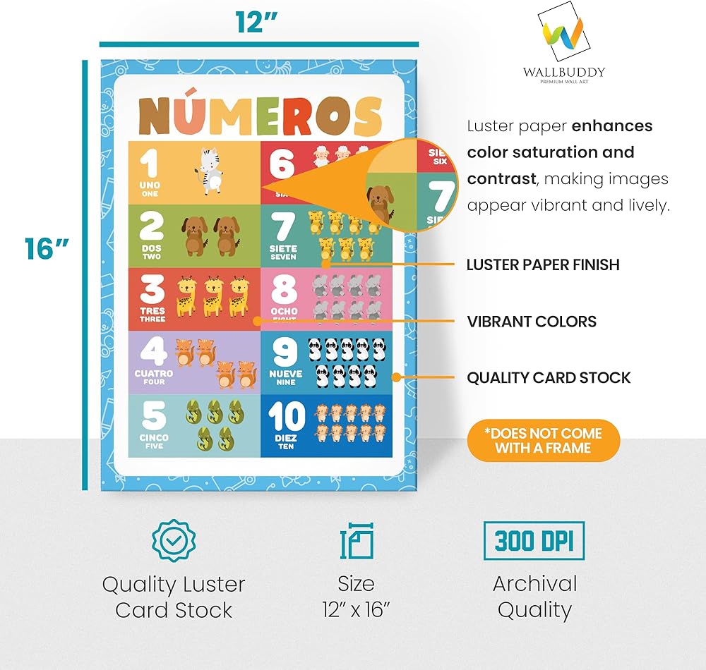 Transform your preschool environment with the Wallbuddy 34 Pack Spanish Educational Posters. This extensive collection includes 18 general educational posters and 16 posters focused on ABCs and 123s, all designed to foster early learning and bilingual development in young children. Covering a diverse range of subjects such as numbers, animals, fruits, maps, and shapes, these posters are crafted to introduce and reinforce essential concepts in both English and Spanish. By providing bilingual exposure, these posters not only enhance language skills but also broaden cognitive abilities in young learners, preparing them for a multicultural world. Each poster is printed on high-quality luster paper using archival ink, ensuring that the vibrant illustrations and clear text remain bright and legible even after extensive use. The 300dpi resolution guarantees that each detail is sharp, making learning visually appealing and engaging for preschoolers. The unframed design of these posters allows for flexible display options. They can be easily framed to match classroom décor or mounted directly on walls for a more interactive and accessible learning experience. This versatility makes it simple to integrate these educational tools into any learning space. Ideal for teachers looking to enrich their classroom resources or parents eager to support their child's educational journey at home, these posters serve as a dynamic teaching aid. They are especially valuable in bilingual classrooms or homes where fostering Spanish language proficiency is a priority. Whether you're decorating a classroom or creating a learning nook at home, the Wallbuddy 34 Pack offers an educational treasure trove that will captivate and educate children, making each learning moment both fun and fruitful. With Wallbuddy's Spanish Educational Posters, you're not just decorating a space; you're inspiring young minds to explore, learn, and grow in two languages.