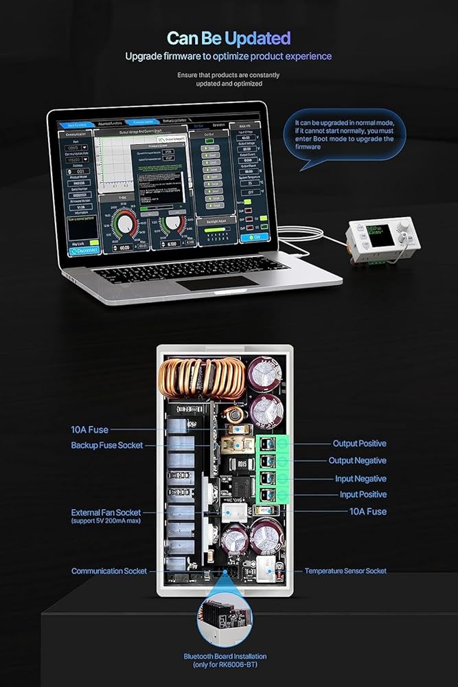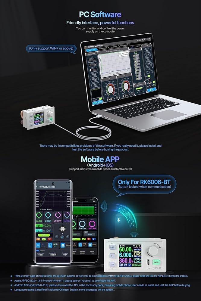 - يدعم RK6006 اتصال USB ببرامج الكمبيوتر، ويمكن أيضًا توصيله بتطبيق الهاتف، لمعرفة طريقة الاتصال، يرجى التحقق من التعليمات
