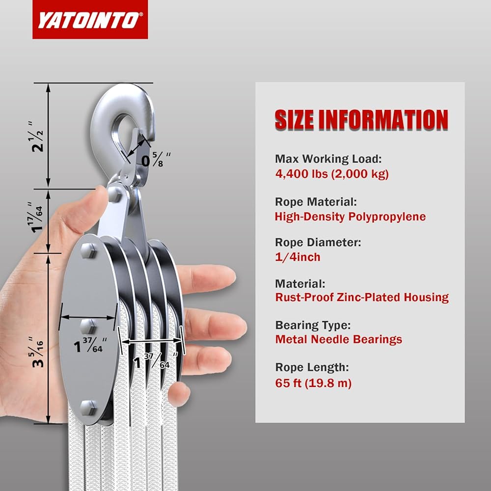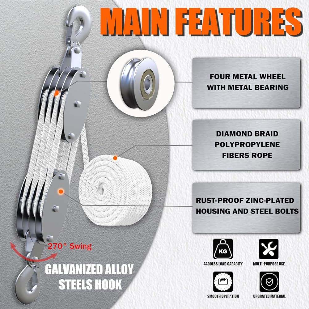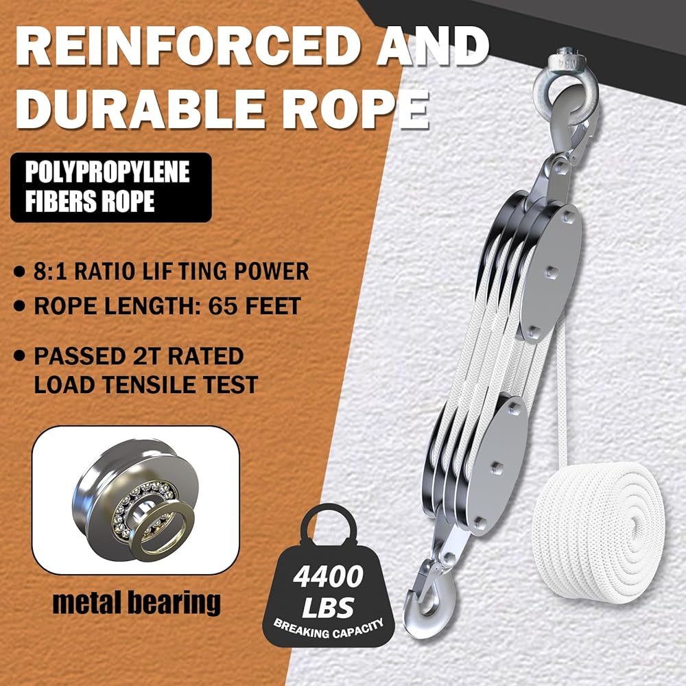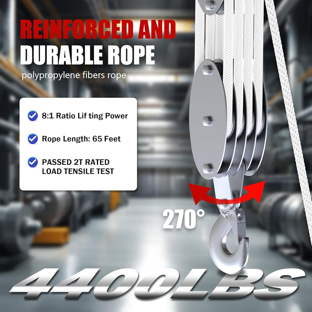 【4400LBS CAPACITY】:This block and tackle pulley system assed 1.25 times the rated load tensile test and 2T rated load tensile test, and made of durable pulley and poly rope with 4400 lbs breaking strength for sturdy and smooth operation; You can lift both heavy and light stuff with this heavy-duty pulley