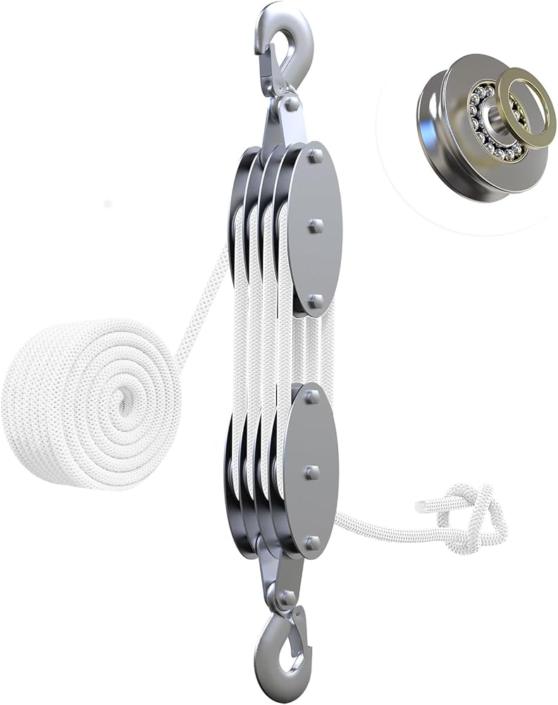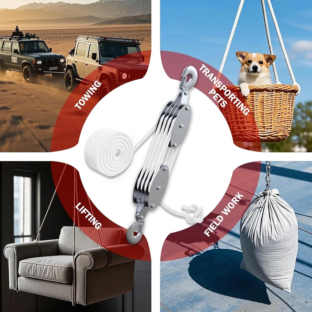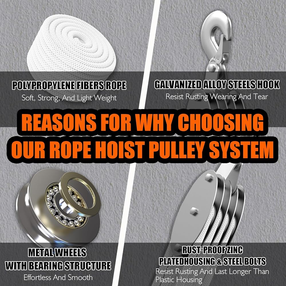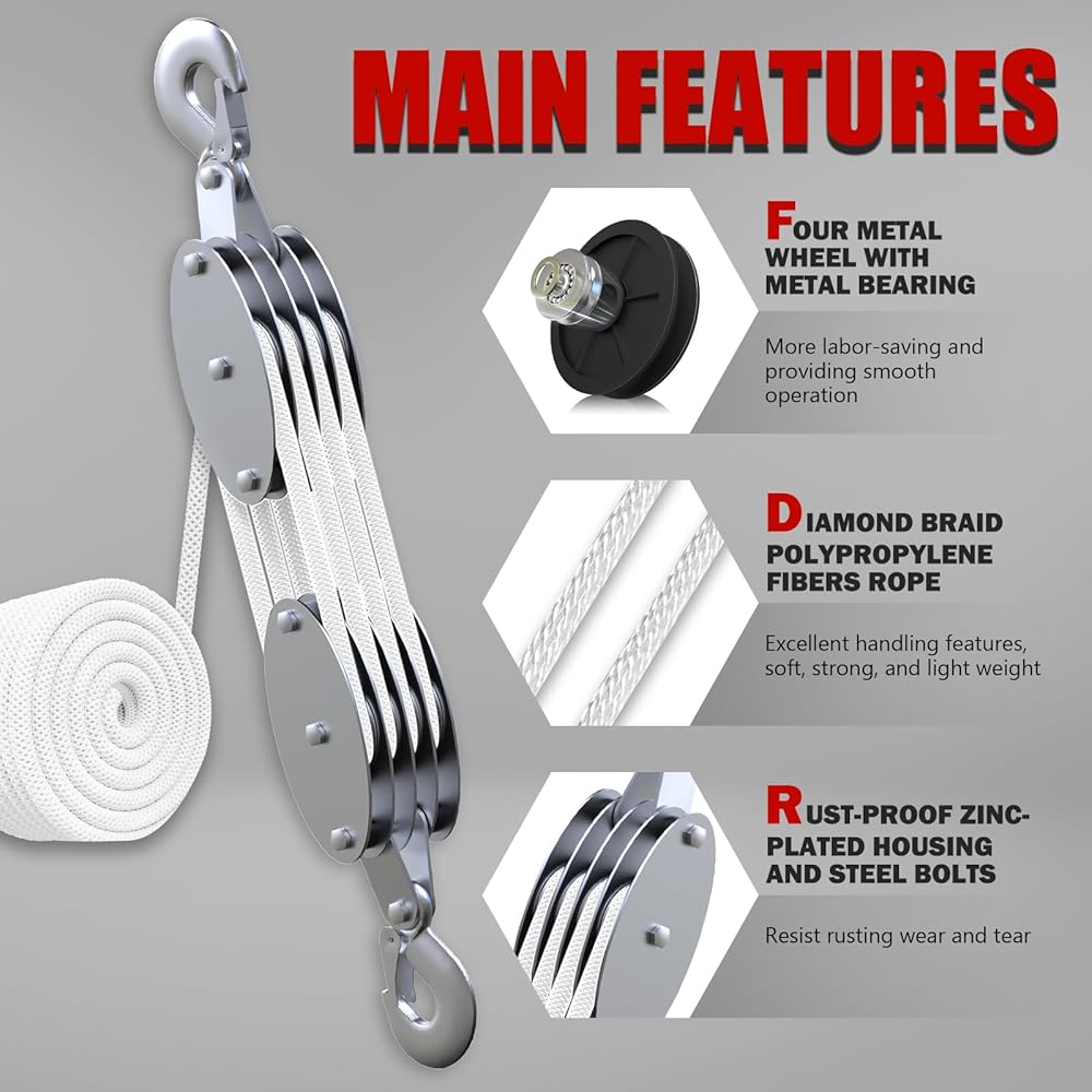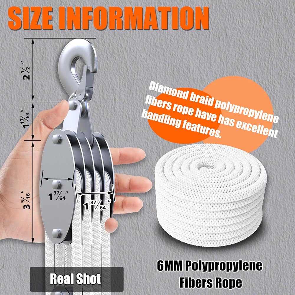 【4400LBS CAPACITY】:This block and tackle pulley system assed 1.25 times the rated load tensile test and 2T rated load tensile test, and made of durable pulley and poly rope with 4400 lbs breaking strength for sturdy and smooth operation; You can lift both heavy and light stuff with this heavy-duty pulley