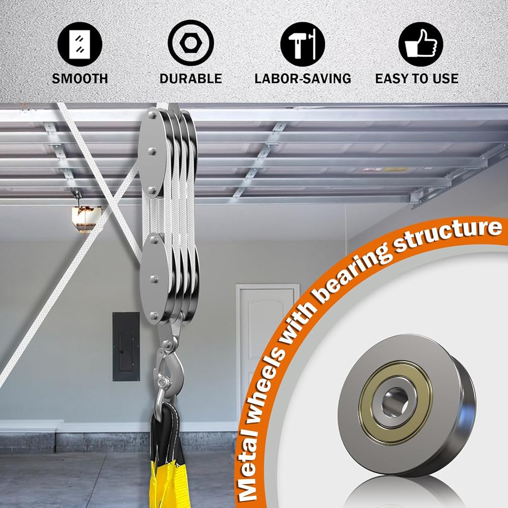 【IMPROVES LIFTING CONVENIENCE】:Metal wheels with bearing structure, more labor-saving and providing smooth operation; 8:1 ratio lifting power can do all the work without electricity or help, and allowing you to lift heavier stuff