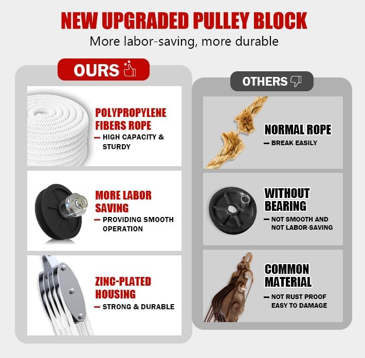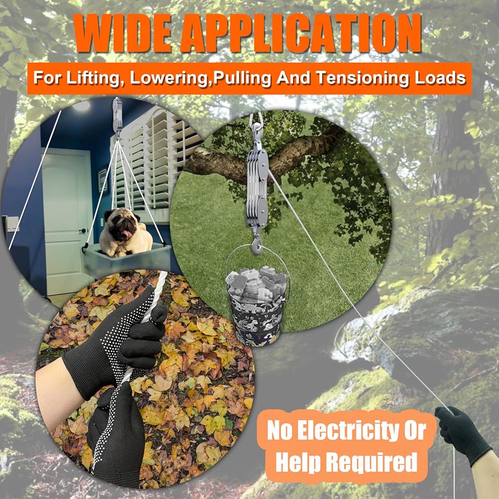 【Wide application】:Heavy-duty rope pulley hoist is suitable for hunting, boating, lifting, garage, pets, tree cutting, didactic, and many more uses; And both sportsmen and people with disabilities or back problems