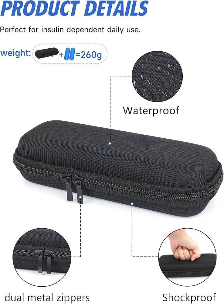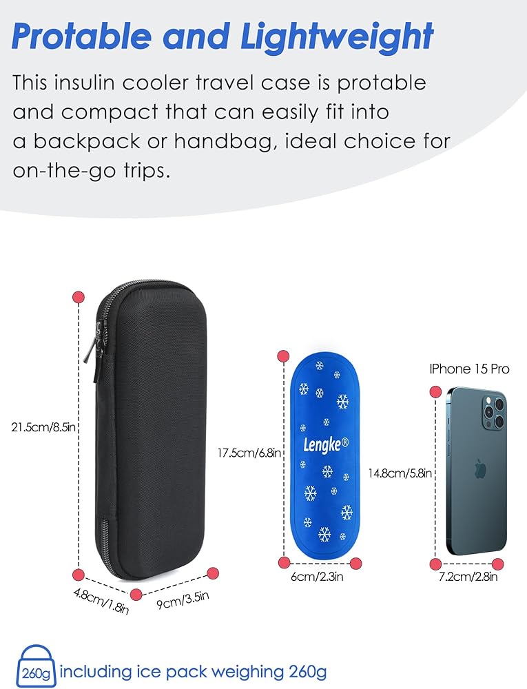 [Compact and Lightweight]This diabetes cooler case measures 8.5 x 3.5 x 1.8 inches and weighs just 0.57 pounds. Its compact and lightweight design allows it to be effortlessly placed in a backpack or luggage without occupying much space, making it easy to carry your diabetes supplies while on the go.