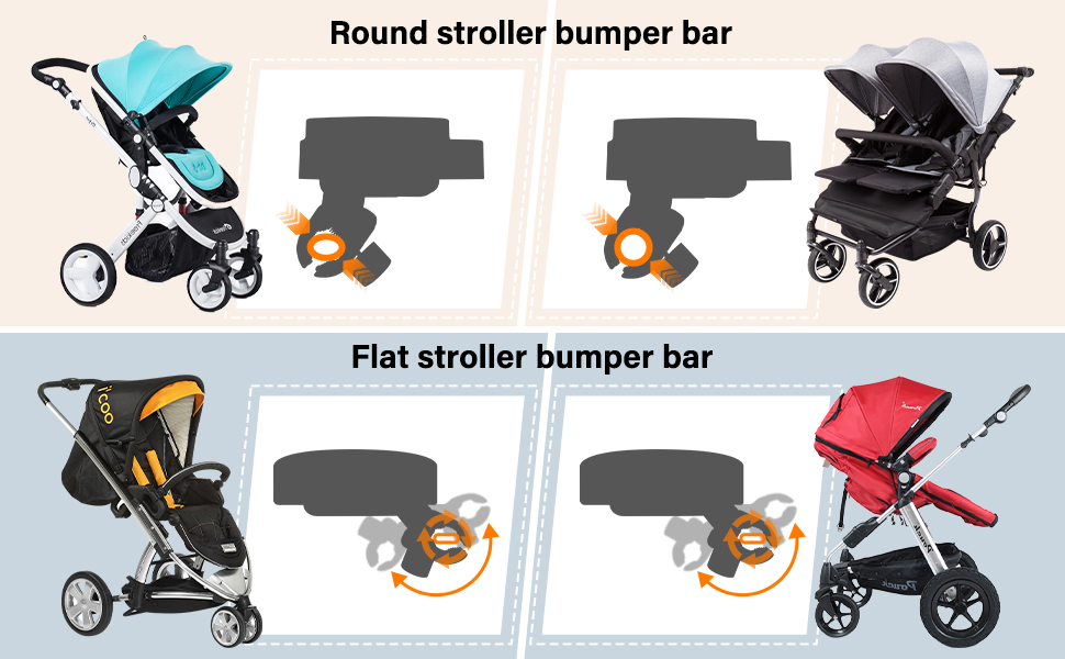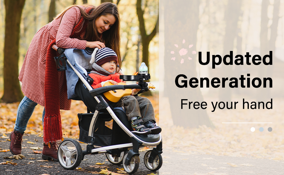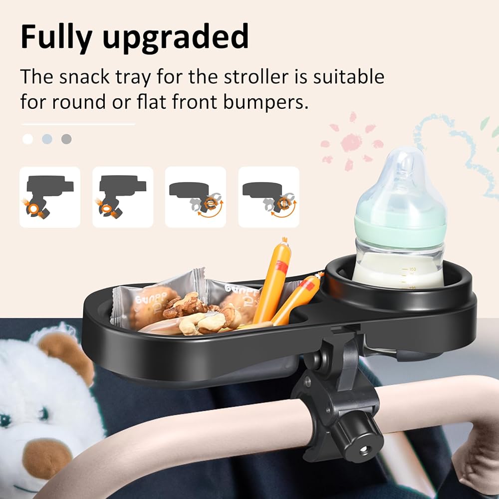 [Compatible with Almost All Strollers] The stroller tray has undergone a complete upgrade, making it compatible with various types of baby strollers that have round and flat front bumpers. And it can be easily rotated in the direction you desire by pressing a button.