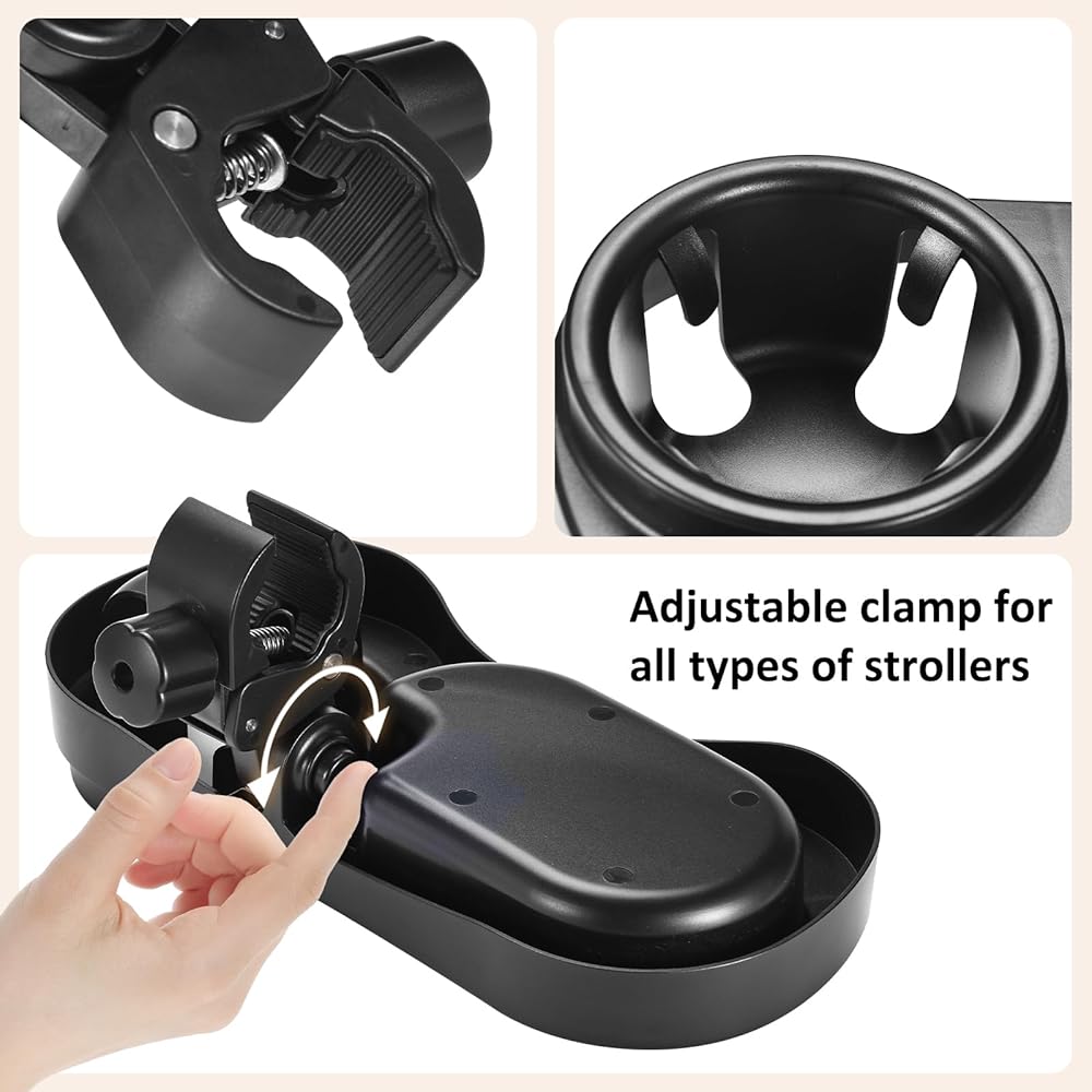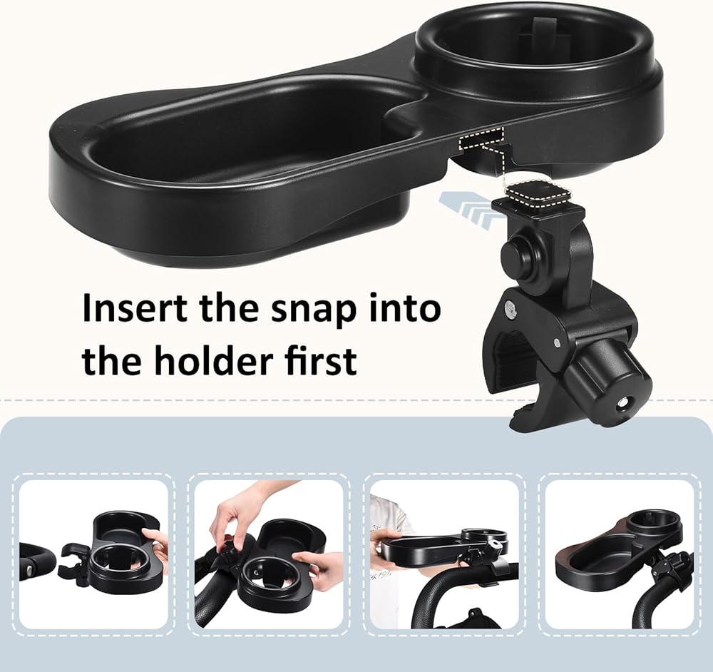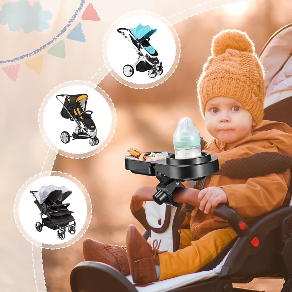 [2 in 1 Stroller Snack Tray] This baby stroller tray is designed to offer additional storage space and features a handy snack tray with a cup holder and snap closure. It is constructed from lightweight, food-grade ABS material and weighs a mere 0.53lb.