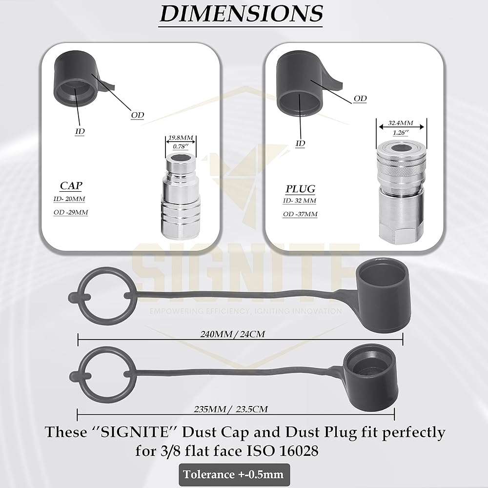 Versatile Compatibility: Engineered to cater to various hydraulic systems, our caps and plugs are specifically designed for flat face hydraulic couplers. This versatility ensures that regardless of the equipment brand, our caps and plugs offer a reliable protective solution, bolstering the durability of your machinery's hydraulic connections.