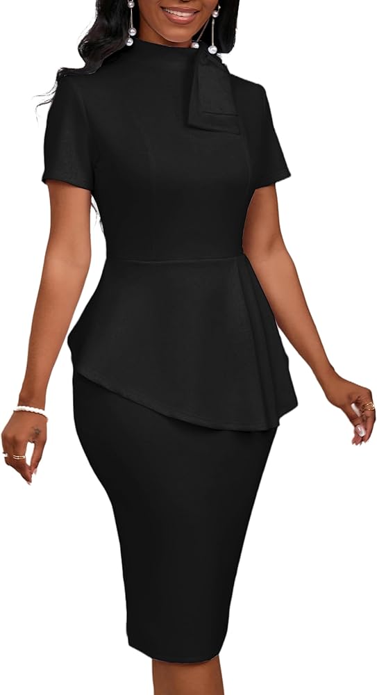 Features: Back zipper closure, little stretchy, peplum dress, side ruffle, Turtle Neck, Slim Fit, Knee Length, Midi Dress, Short Sleeve, This dress is absolutely amazing and it fits your curves perfectly.