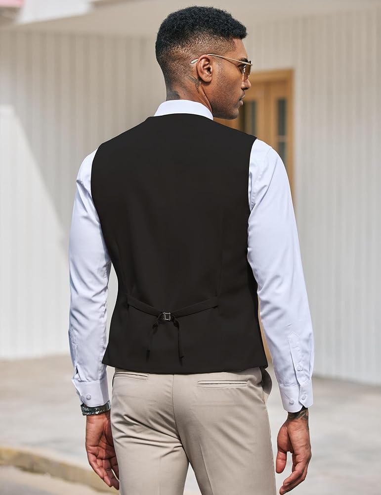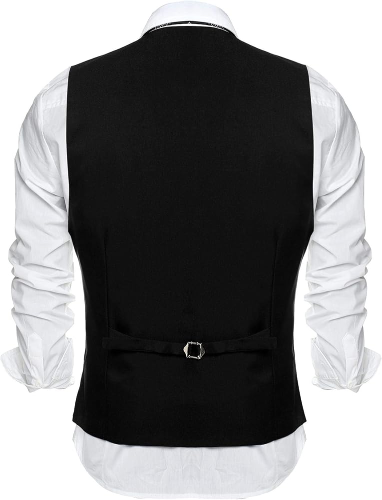 【Casual & Elegant Looking】Business vest is designed with classic solid color, V-neck, 3-buttons closure and 1 real pocket on the front, 2 real side pockets. The back adjustable Waistcoat offers a more accurate fit, makes you stand out in the crowd.