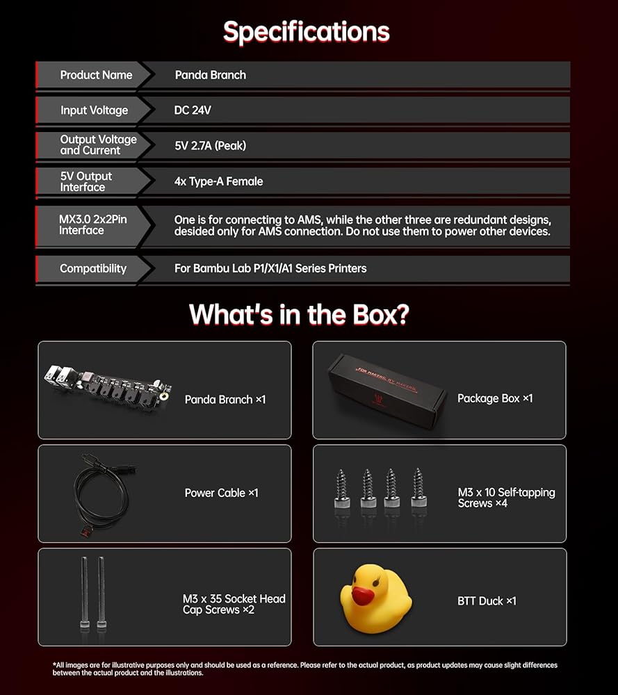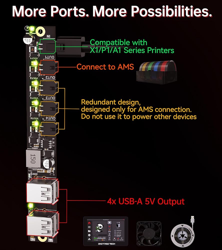 【Compatible with AMS】BTT Panda Branch comes with 4 24V power ports and 4 MX3.02x2-Pin connectors, which makes it fully compatible with the AMS system of Bambulab. The other 3 24V ports are redundant design and can only be used to connect AMS. All the 4 24 ports CAN NOT serve as power supply for other devices except AMS.
