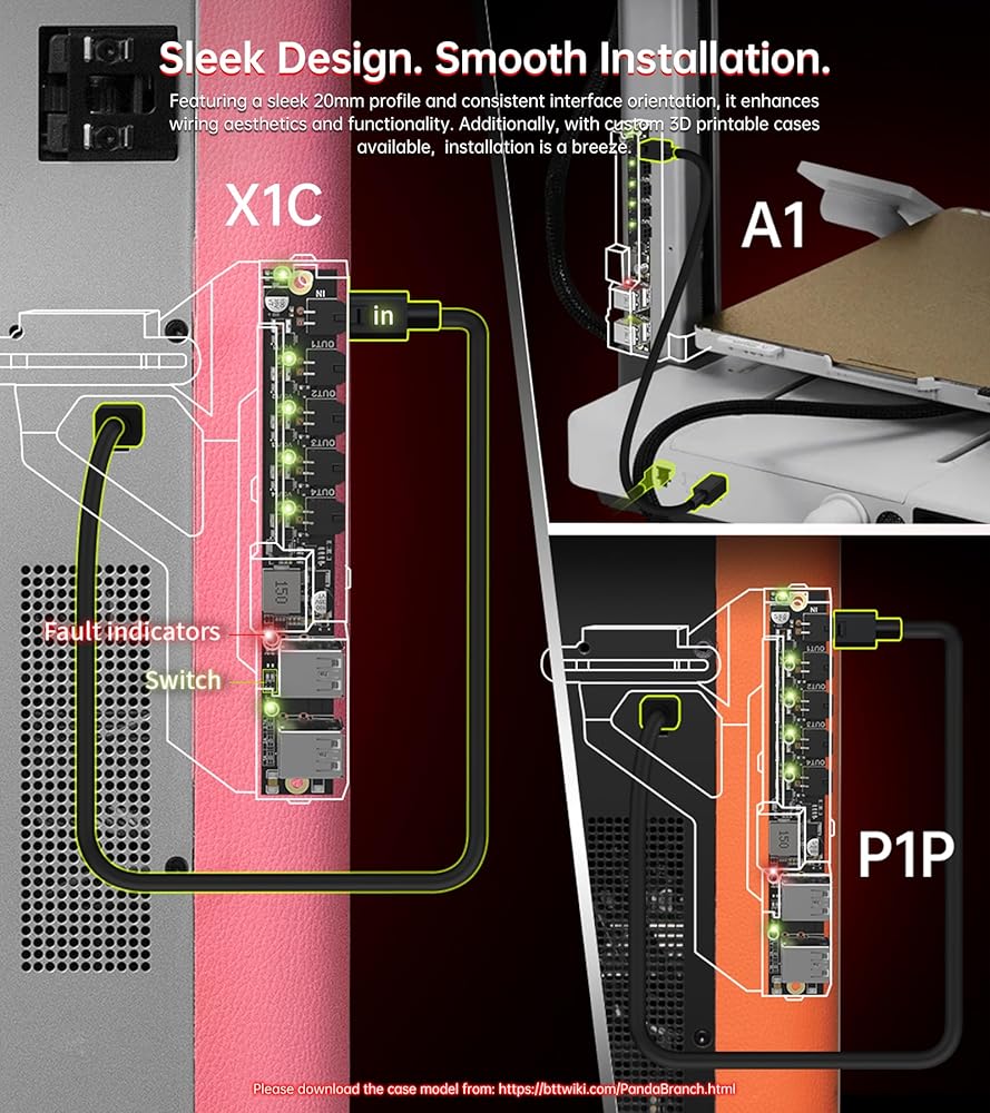 【Easy Installation】A printed housing case is specially designed for all Bambulab printers, please download it on BIGTREETECH github. The housing case allows easy DIY installation to the printer for the perfect fit! Panda Branch is designed for neat and efficient cable management with a slim profile of just 20mm in width.