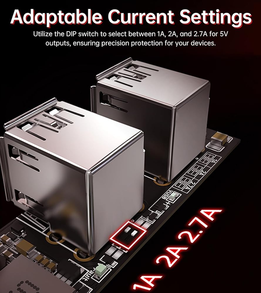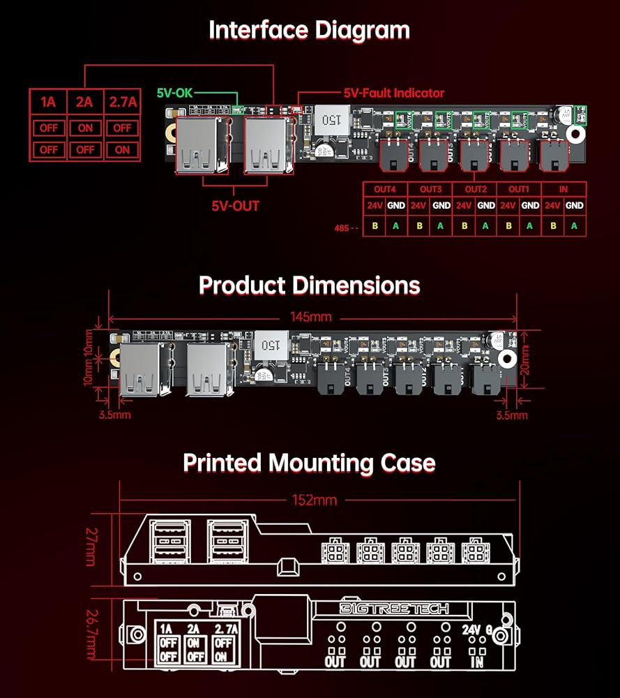 【Multi-devices Expansion】Equipped with 4 USB-A 5V output ports, BIGTREETECH Panda Branch is perfect for 'branching out' your Bambulab printers' capabilities. Its adjustable current settings(1A/2A/2.7A), together with the meticulous onboard protection, enables it to support a variety of devices such as a USB lightstrip, the Panda Touch and USB fans, meeting the need of multi-devices connections from Bambulab users. Note: Total current of all devices SHOULD NOT exceed 2.7A.