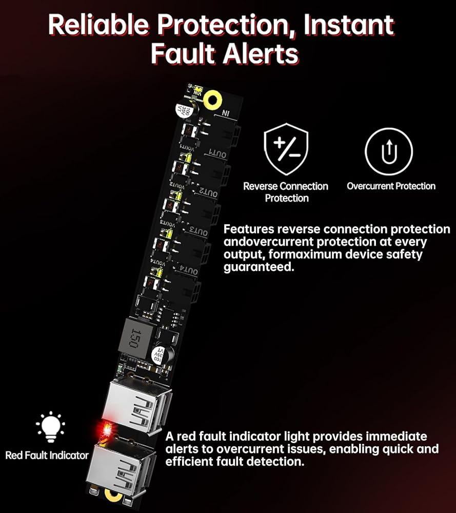 【Safety First】All output ports of our Panda Branch are equipped with reverse polarity protection and overcurrent fuses, ensuring the safety of your connected devices. The fault indicator light will glow red when overcurrent occurs, making troubleshooting much quicker.