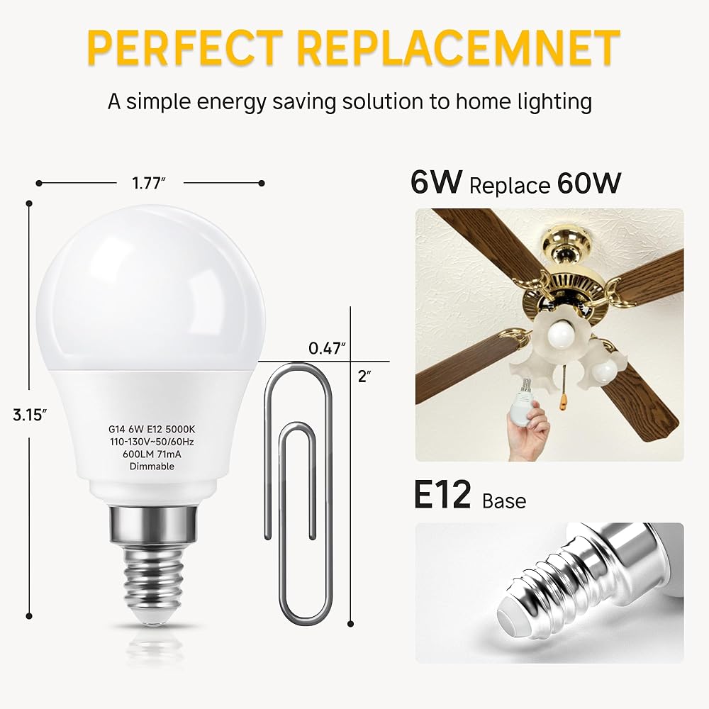 • Energy Efficient and Quality: 60 watt equivalent but only 6 watt, spend less on electric cost and get more energy efficiency. With more durable aluminum material and energy-saving led, these E12 led bubs are longer lasting than other poor-quality light bulbs, eliminating the hassle of frequent bulb replacement