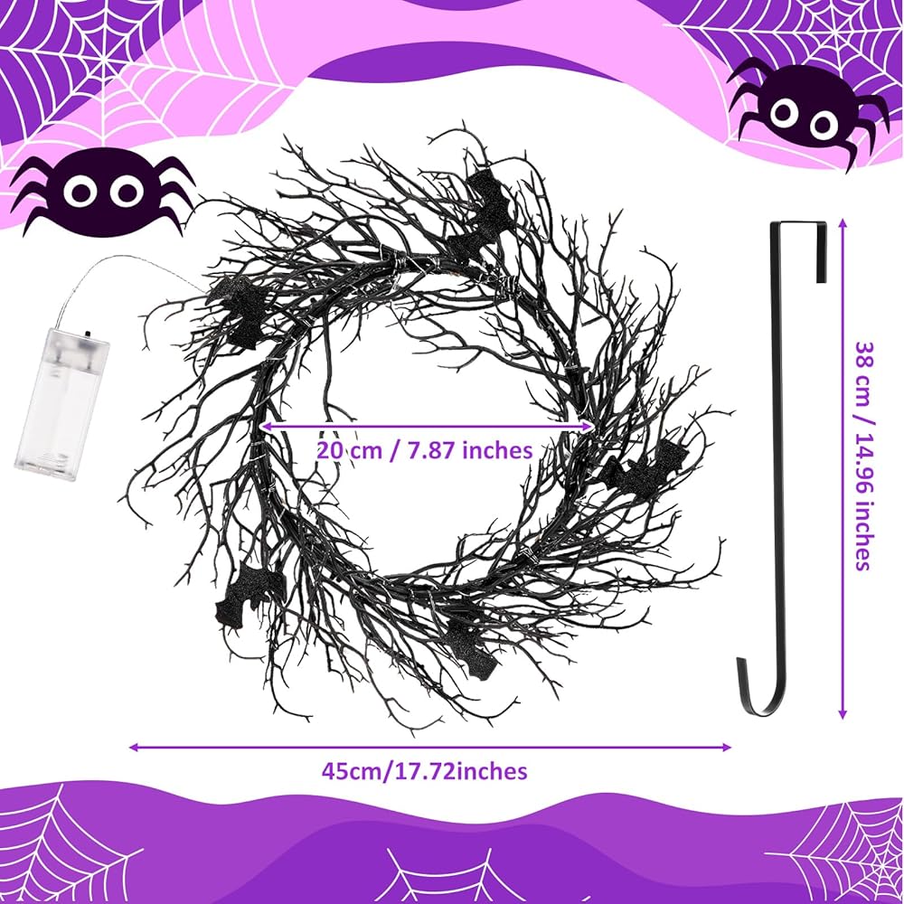 Black Bat Halloween Wreath with Hook LED Purple Lights 18 Inch Halloween Wreath with Lights Halloween Door Wreath for Front Door Halloween Decoration Indoor Outdoor Home Party Props