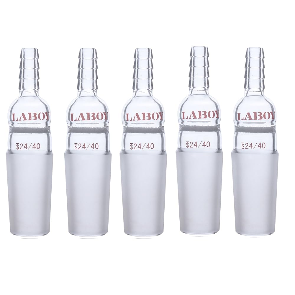 Vacuum straight inlet adapter with inner glass joint at bottom , a verdical hose connection at top and a fritted disc between the joint and hose connection; The standard taper lower joint can provide a leak free way to any lab glassware parts with standard taper female joint, interchanable, durable and reusable; The glass hose connector has an O. D. of 10mm at the largest serration ideal for vent or introducing glass or vacuum during a vacuum distillation, fractionation etc in organic chemistry, accepts 3/8” ID flexible rubber or PTFE tubing. Laboy Glass inlet adapter is made of high-quality borosilicate glass and annealed at 800 degree Celsius , can be heated directly in an open flame and can withstand typical laboratory thermal variations in chemistry processes like heating and cooling. All the jointed glassware products in Laboy are made by hand-blowing, heavy wall design, for the interchangeable joints, they are finely grounded both by machined and hand to ensure leak free. All the glass joints has a standard 1: 10 taper, it can fit any glassware with joint which has the same taper and same outside diameter as long as the apparatus to which they are attached does not interfere. For example, an adapter with 14/20 male joint will fit into a 14/35 flask.