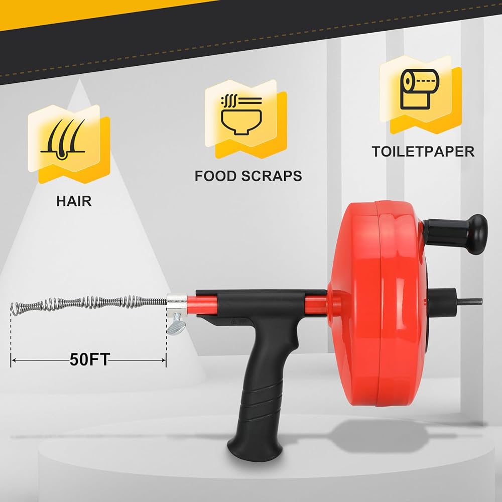 [Extra Large Size] 50-Ft extra-long drain cleaning Cable,Full-featured, suitable for different depths of pipe.The long spring structure can adapt to different shapes of pipe curves and easily handle clogged drains