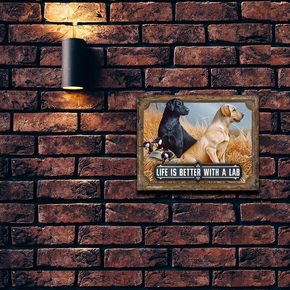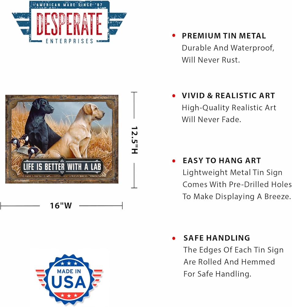 Tin Sign Details: Size is 16"W x 12.5"H. Crafted from lightweight metal tinplate and manufactured with pre-punched holes in each corner for easy hanging. This makes them convenient for display on walls, doors, fences, or other surfaces.